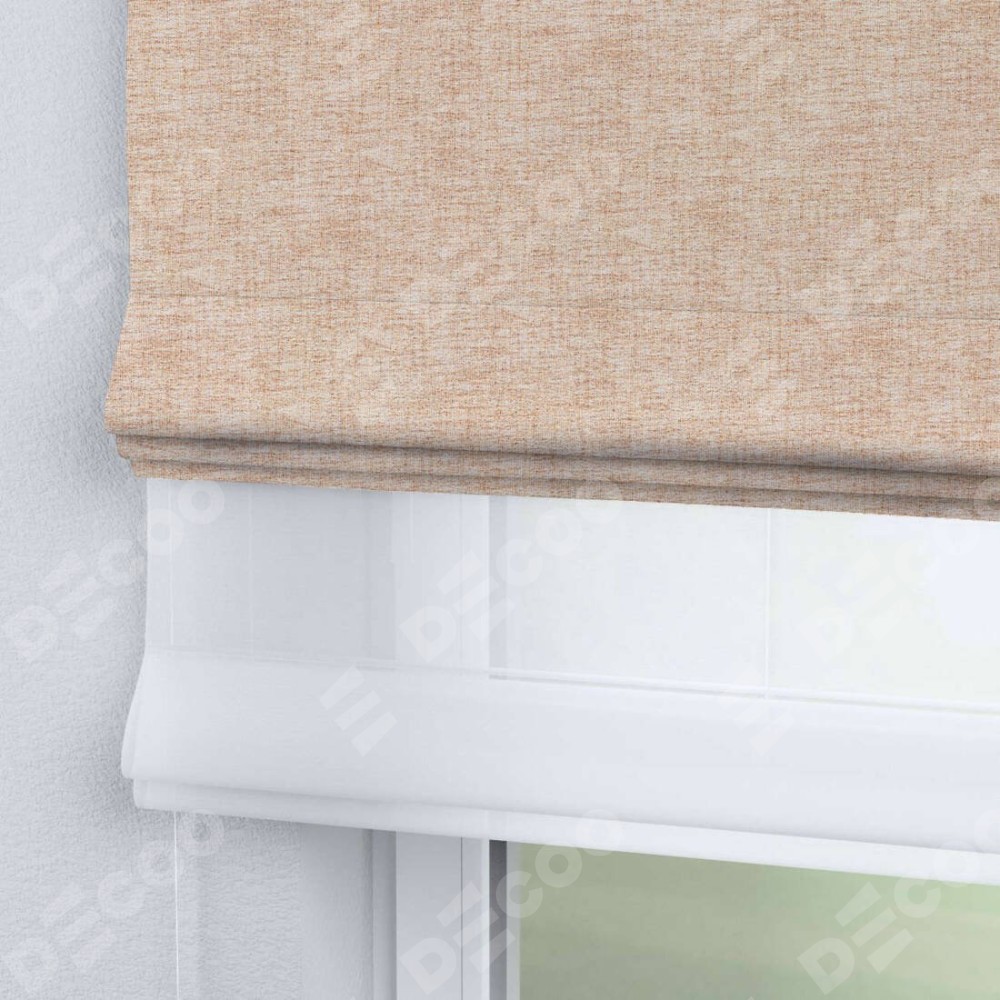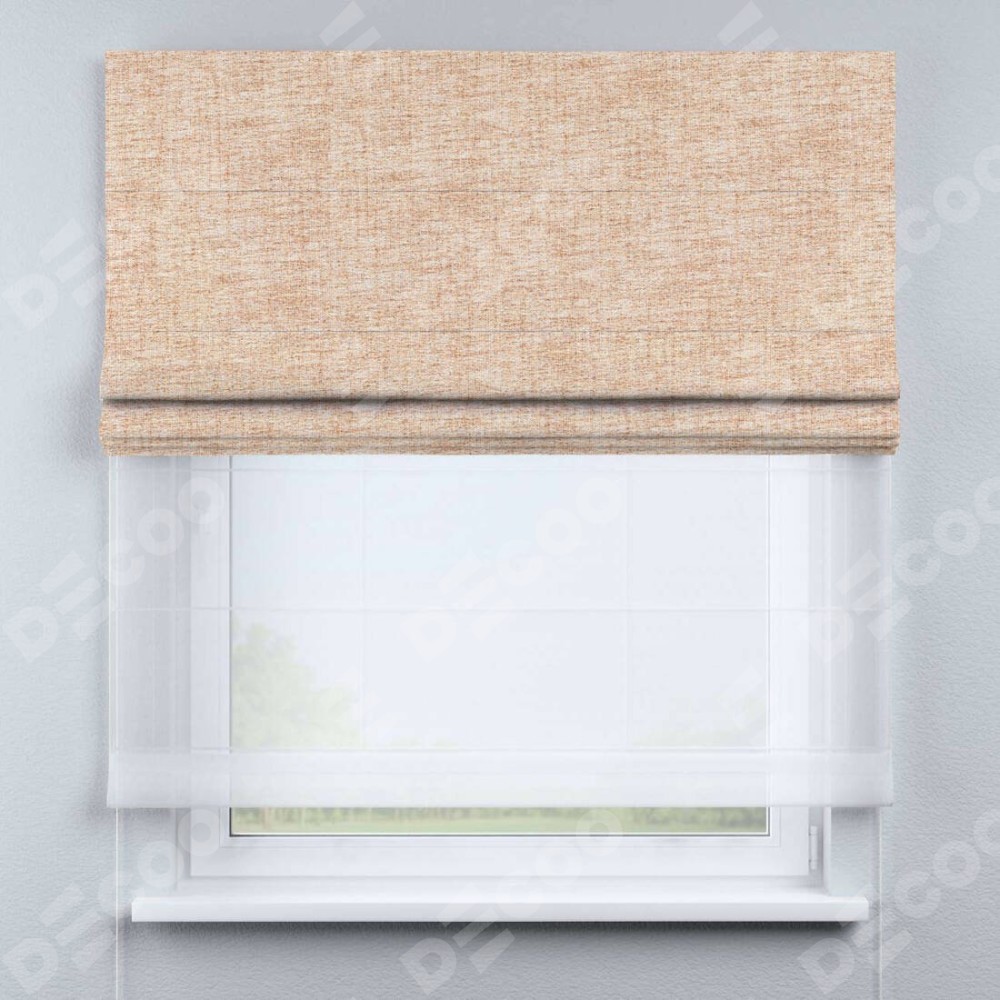 Двойная римская штора «День-ночь» от производителя Cortin предназначена для использования в проёмах. Эта штора уникальна тем, что состоит из двух полотен. На лицевой стороне находится рогожка димаут персиковый (артикул: 91016), обеспечивающая комфортное затемнение. В комплект также входит вторая ткань — легкий белый тюль (артикул: V-01), который добавляет изящества и легкости оформлению окна. Кроме того, доступны и другие разновидности ткани тюль, выбор которых доступен по ссылке .