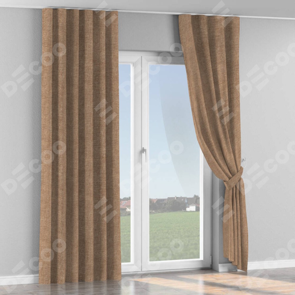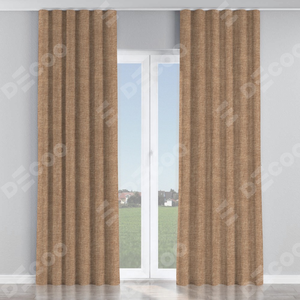 Комплект прямых штор, от производителя «Cortin», пошиты из ткани рогожка димаут светло-коричневый, артикул ткани 91017. С изнаночной стороны в верхней части штор пристрачивается шторная лента с декоративными складками «Волна». Для создания элегантных складок прямые шторы шьются по стандарту с коэффициентом 1:2 (на 100 см. ширины проёма 200 см. ширины ткани).