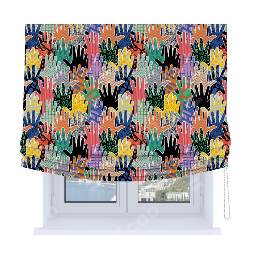 Римская штора Soft производителя «Cortin», используется для проёма, пошита из ткани блэкаут с нанесением сублимационной печати «Коллаж поп-арт». Имеет универсальный механизм и подходит для монтажа: на потолок, на стену и в нишу. В отличие от стандартных римских штор, римская штора Soft не имеет горизонтальных вставок и нижнего отвеса. Это позволяет ткани произвольно драпироваться в свободные мягкие складки.