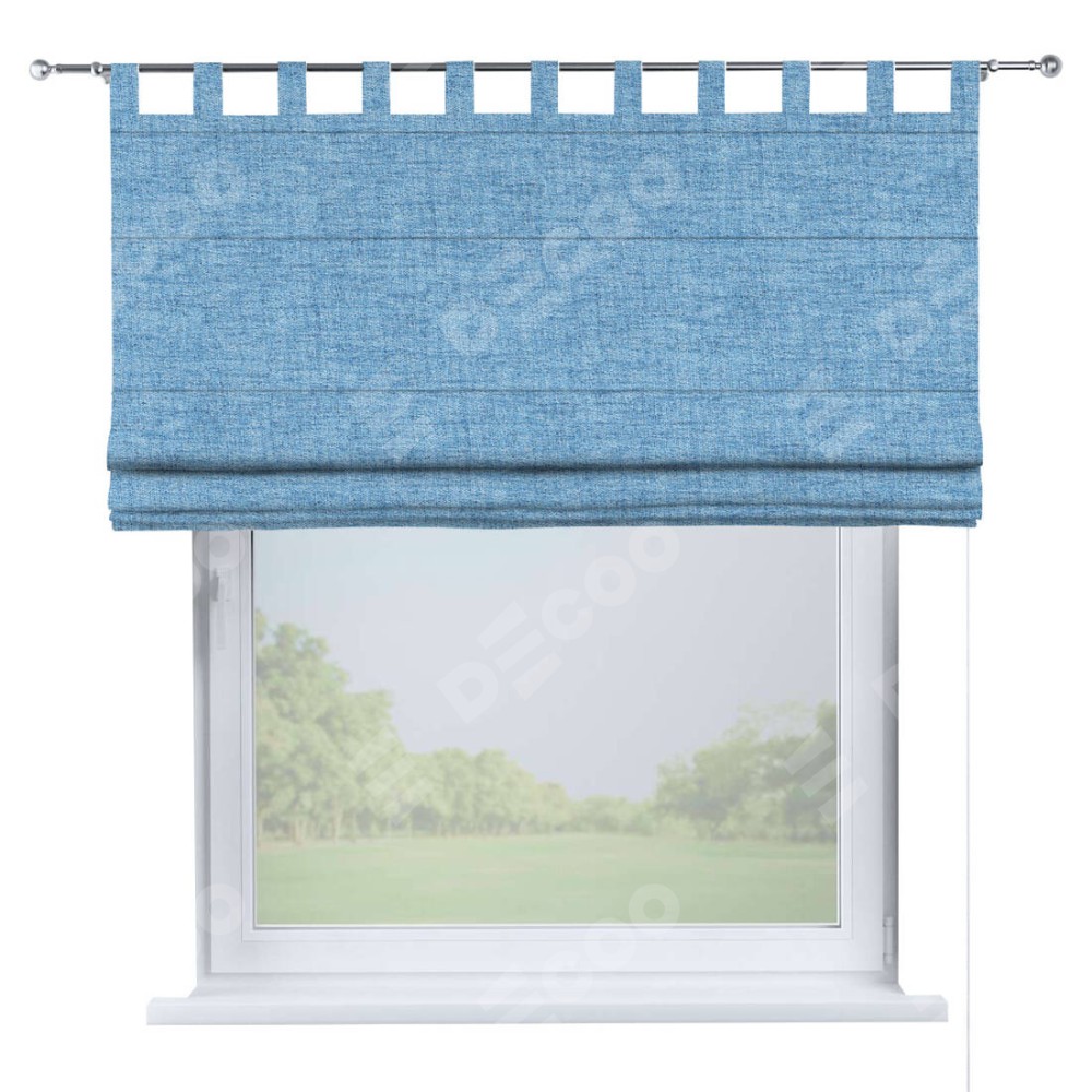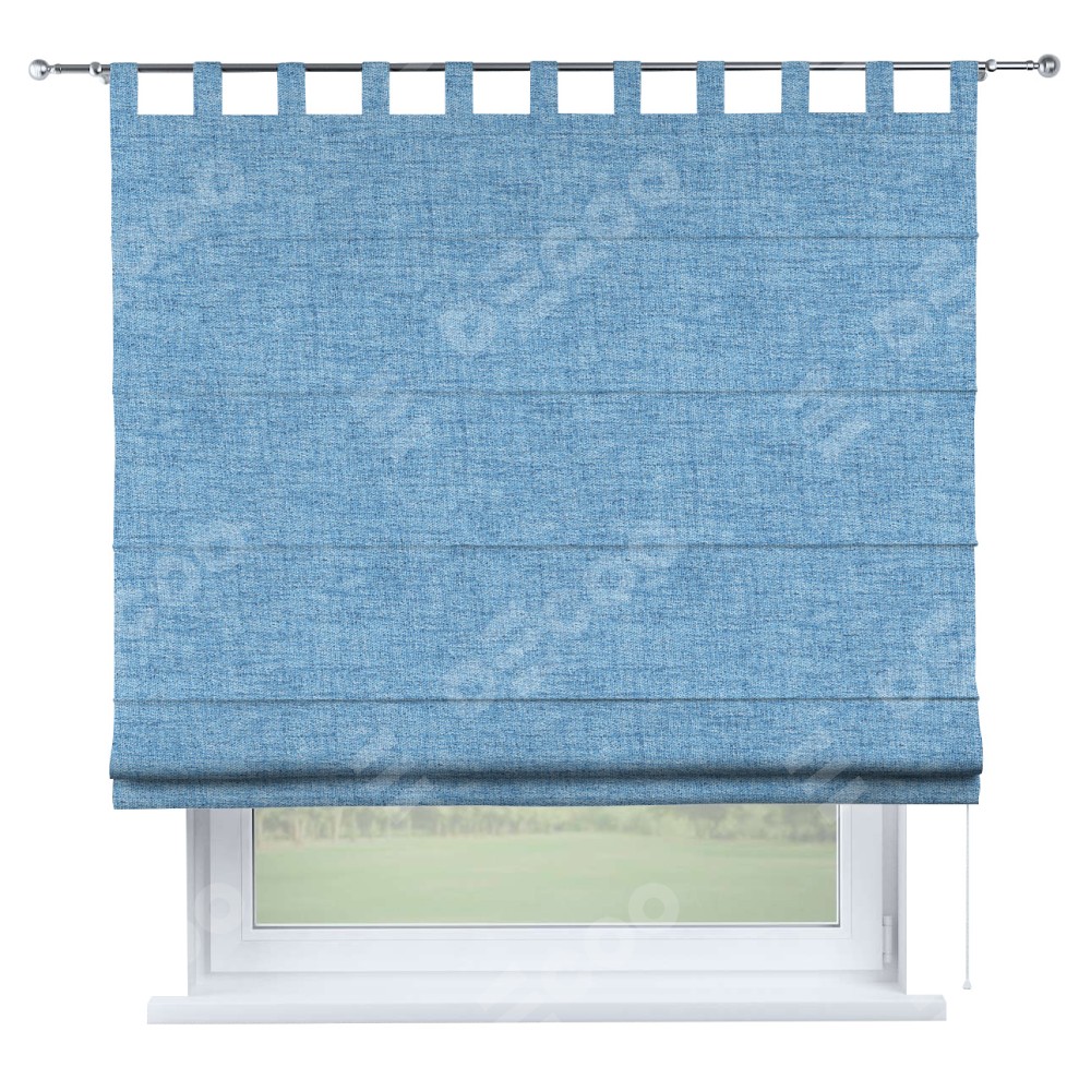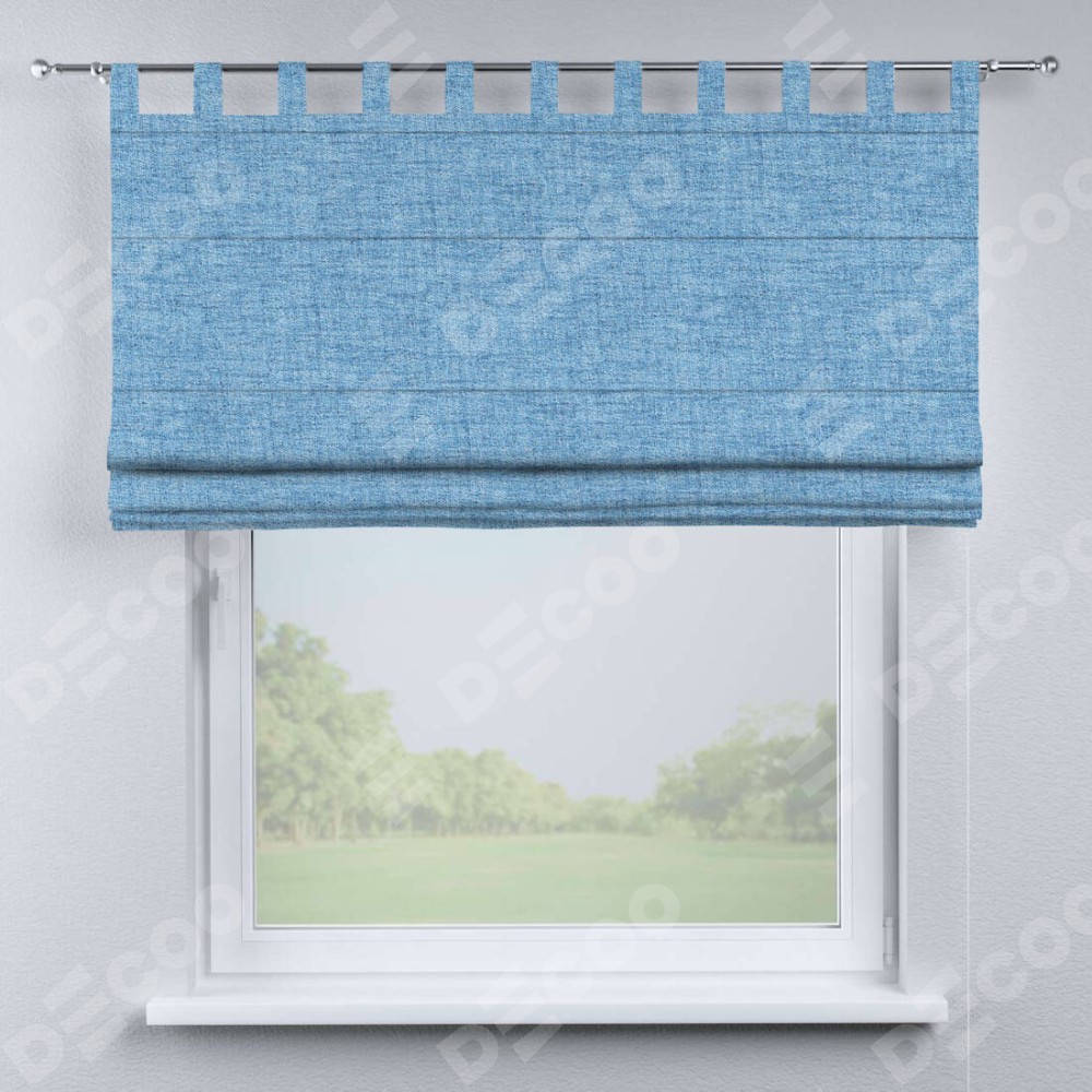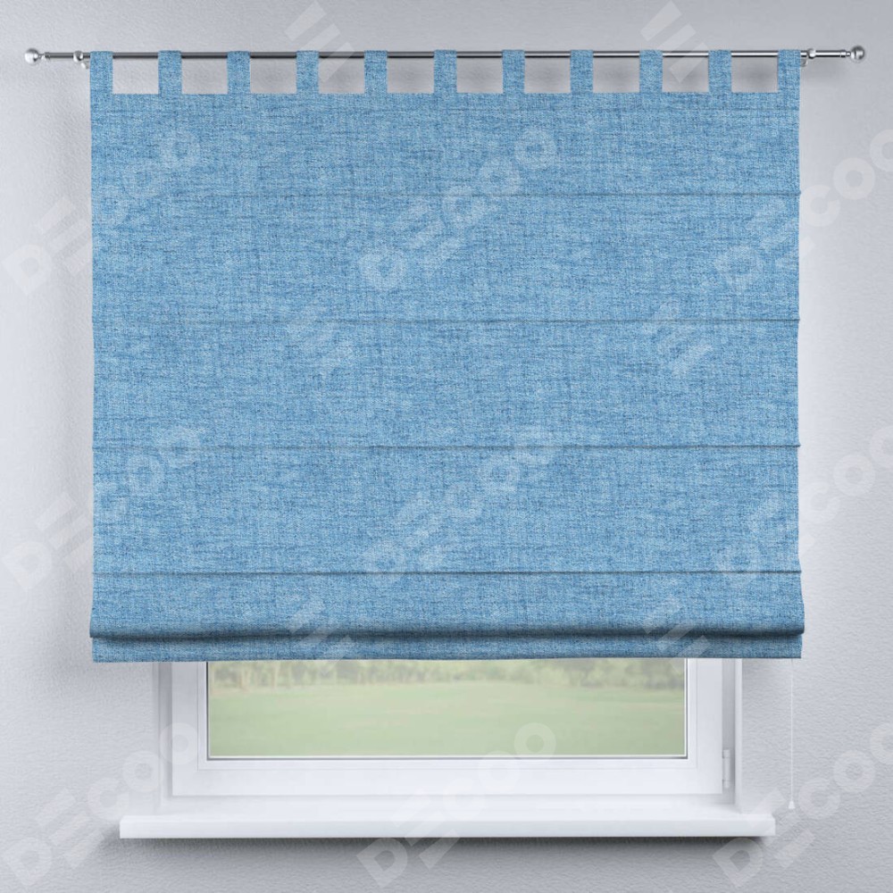 Римская штора производителя «Cortin», используется для проёма, пошита из ткани рогожка димаут голубой, артикул ткани 91025. Данная модель пошита на петлях, комплектуется на выбор круглым карнизом и подходит для монтажа на стену. Римская штора на петлях имеет простую систему регулировки высоты, отличительным преимуществом данной модели является простой способ монтажа. Достаточно повесить ее на трубу и штора готова!