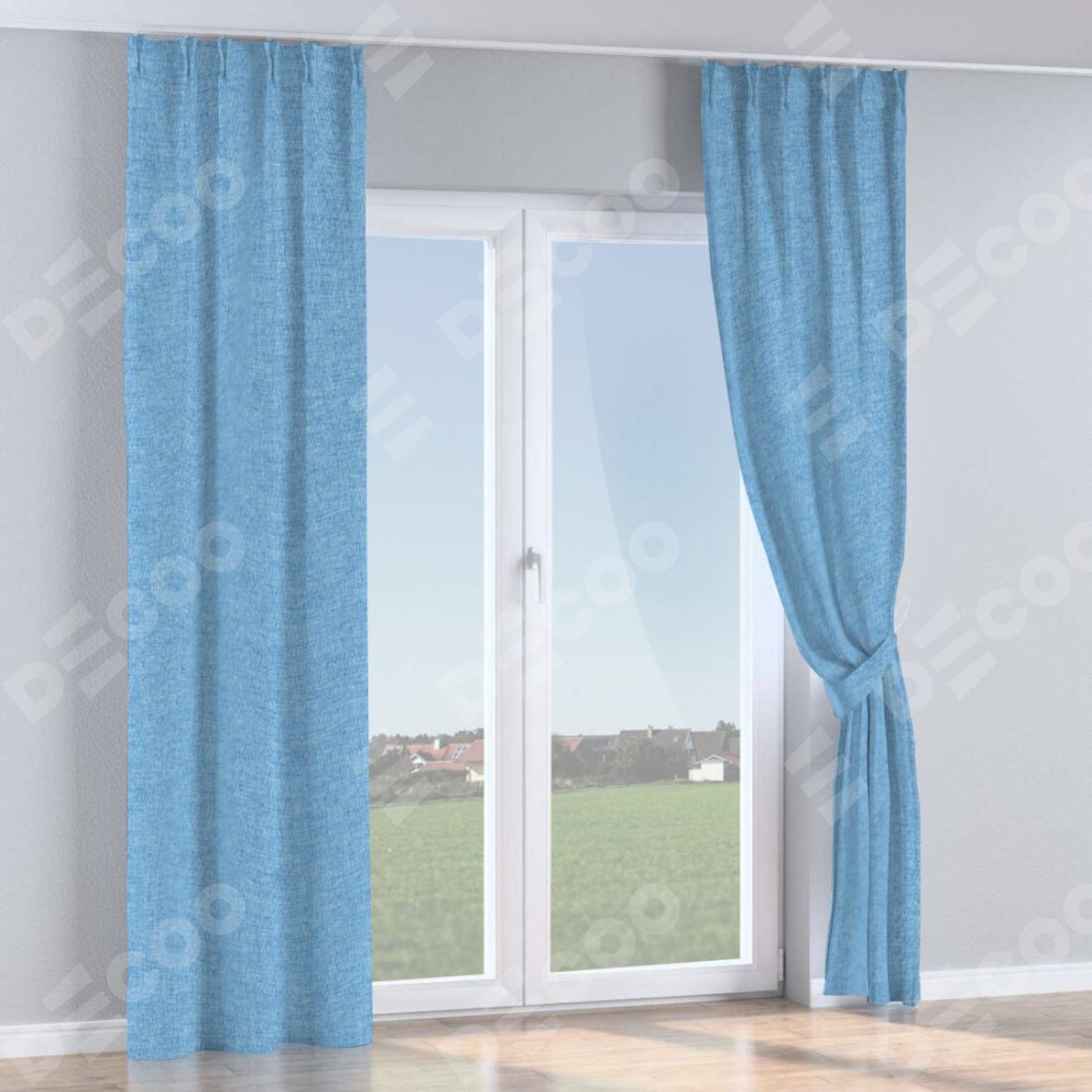 Комплект прямых штор, от производителя «Cortin», пошиты из ткани рогожка димаут голубой, артикул ткани 91025. С изнаночной стороны в верхней части штор пристрачивается шторная лента с декоративными складками «Кустик». Для создания элегантных складок прямые шторы шьются по стандарту с коэффициентом 1:2 (на 100 см. ширины проёма 200 см. ширины ткани).