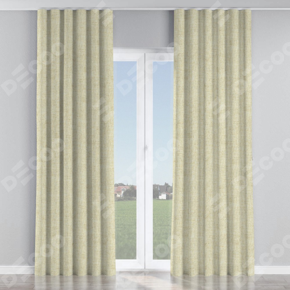 Комплект прямых штор, от производителя «Cortin», пошиты из ткани рогожка димаут золотой песок, артикул ткани 91015. С изнаночной стороны в верхней части штор пристрачивается шторная лента с декоративными складками «Волна». Для создания элегантных складок прямые шторы шьются по стандарту с коэффициентом 1:2 (на 100 см. ширины проёма 200 см. ширины ткани).