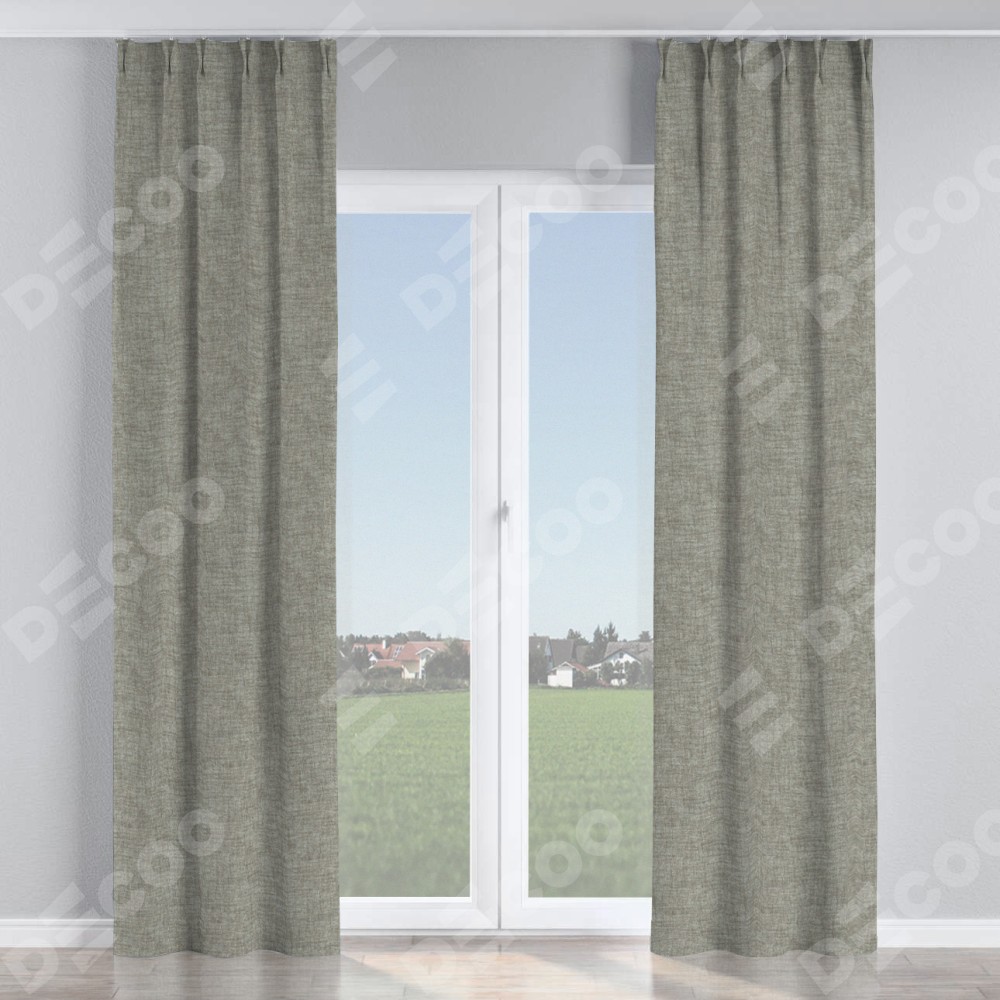 Комплект прямых штор, от производителя «Cortin», пошиты из ткани рогожка димаут серый дуб, артикул ткани 91028. С изнаночной стороны в верхней части штор пристрачивается шторная лента с декоративными складками «Кустик». Для создания элегантных складок прямые шторы шьются по стандарту с коэффициентом 1:2 (на 100 см. ширины проёма 200 см. ширины ткани).