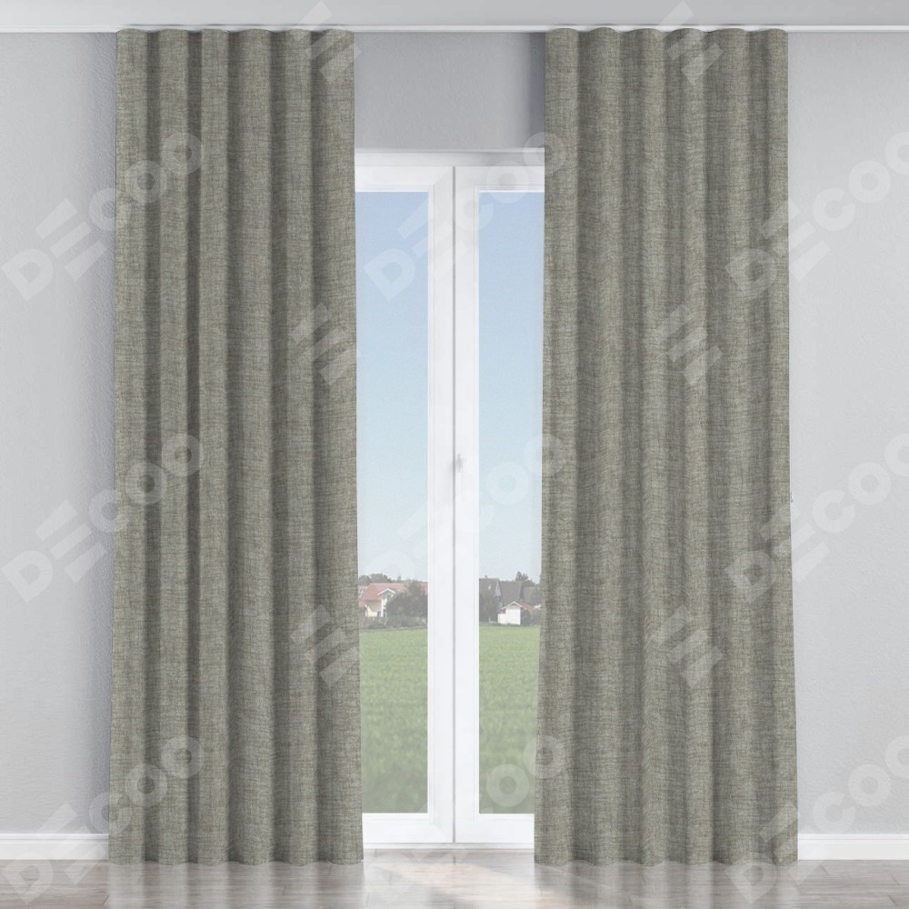 Комплект прямых штор, от производителя «Cortin», пошиты из ткани рогожка димаут серый дуб, артикул ткани 91028. С изнаночной стороны в верхней части штор пристрачивается шторная лента с декоративными складками «Волна». Для создания элегантных складок прямые шторы шьются по стандарту с коэффициентом 1:2 (на 100 см. ширины проёма 200 см. ширины ткани).