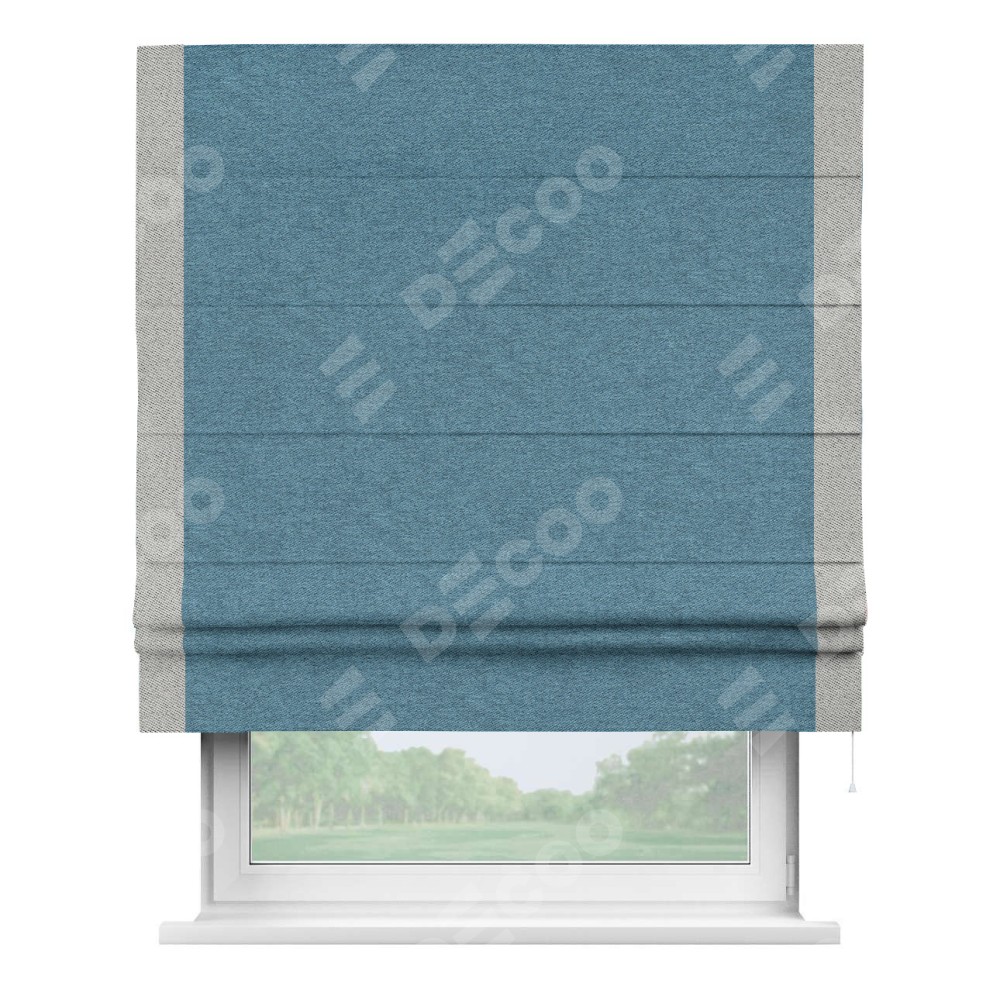 Римская штора пошита из ткани твид блэкаут светло-синий, артикул: 90935, с отделкой кантом «Стрим Дуо» выделяется наличием кантов по обоим бокам шторы, слева и справа. Этот дизайн придает шторе аккуратный и завершенный вид, акцентируя вертикальные линии и визуально вытягивая окно в высоту. Отделка кантом по бокам не только украшает штору, но и служит практической функцией, укрепляя края и продлевая срок службы изделия.
