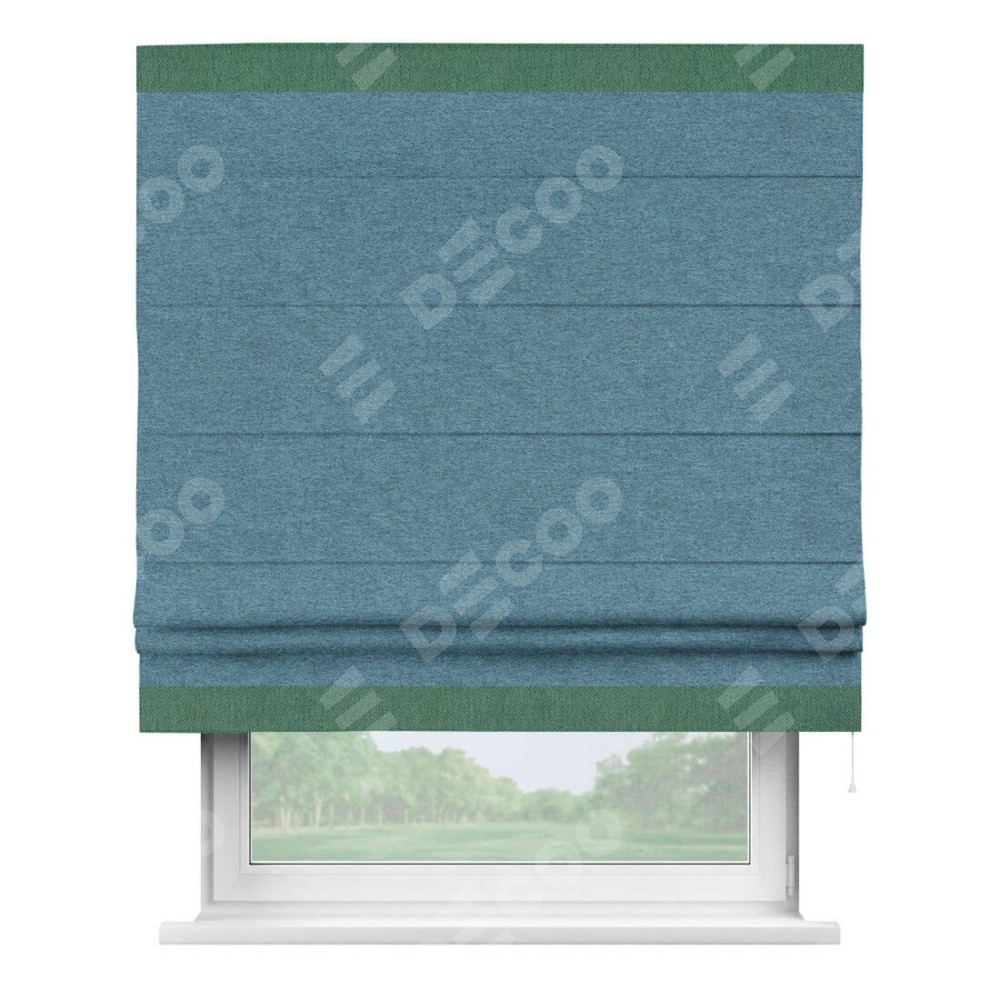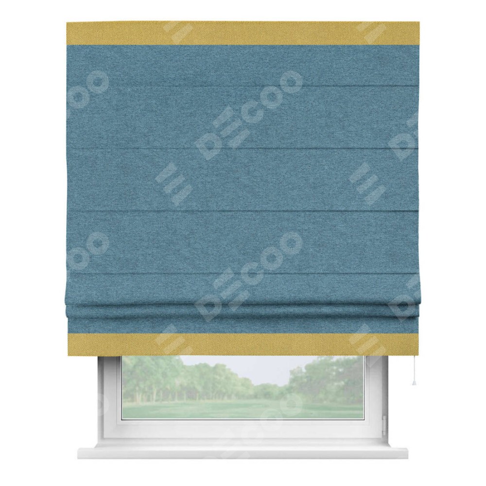 Римская штора пошита из ткани твид блэкаут светло-синий, артикул: 90935, с отделкой кантом «Горизонт» предлагает уникальное дизайнерское решение, при котором кант располагается только вверху и снизу шторы. Такое решение делает акцент на горизонтальных линиях, визуально расширяя пространство и придавая окну более строгий и организованный вид. Отделка кантом в этих ключевых местах не только украшает штору, но и способствует её долговечности, защищая наиболее уязвимые к износу края.