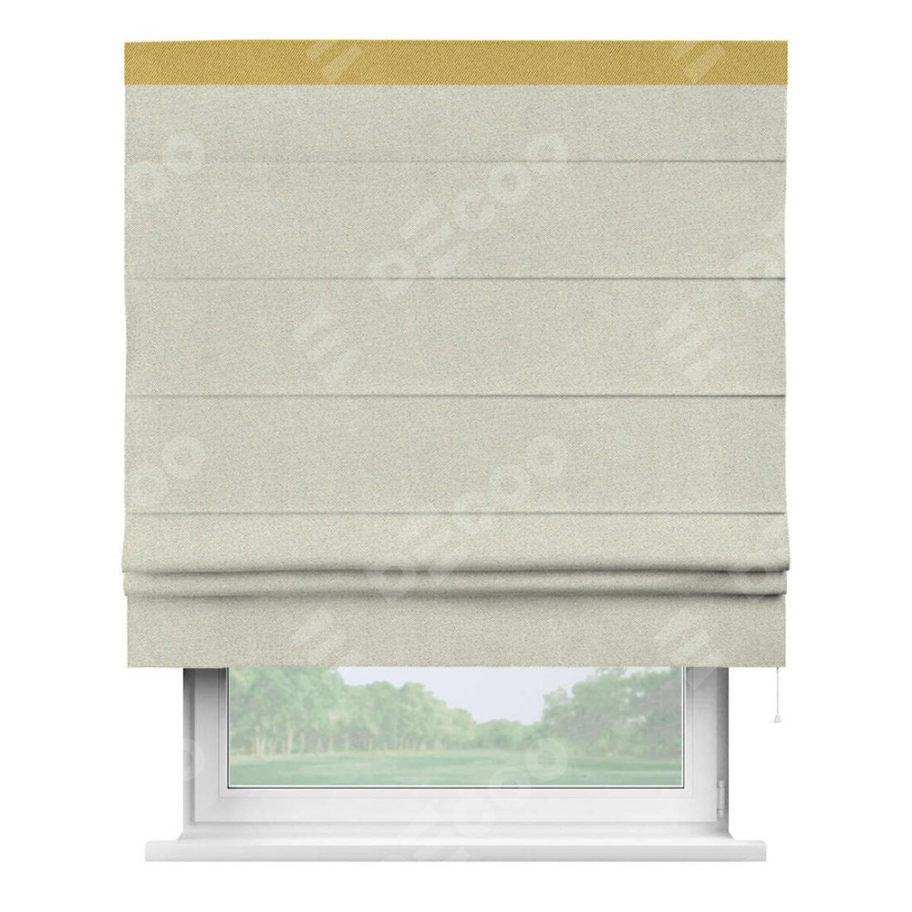 Римская штора пошита из ткани твид блэкаут шампань, артикул: 90929, с отделкой кантом «Кинг» отличается своей необычной особенностью: кант располагается исключительно сверху шторы. Такой дизайн делает акцент на верхней части окна, визуально поднимая потолок и придавая интерьеру более возвышенный и изысканный вид. Отделка кантом на верхней кромке не только украшает штору, но и может служить дополнительной защитой от износа в месте наибольшего контакта с механизмом управления шторой.