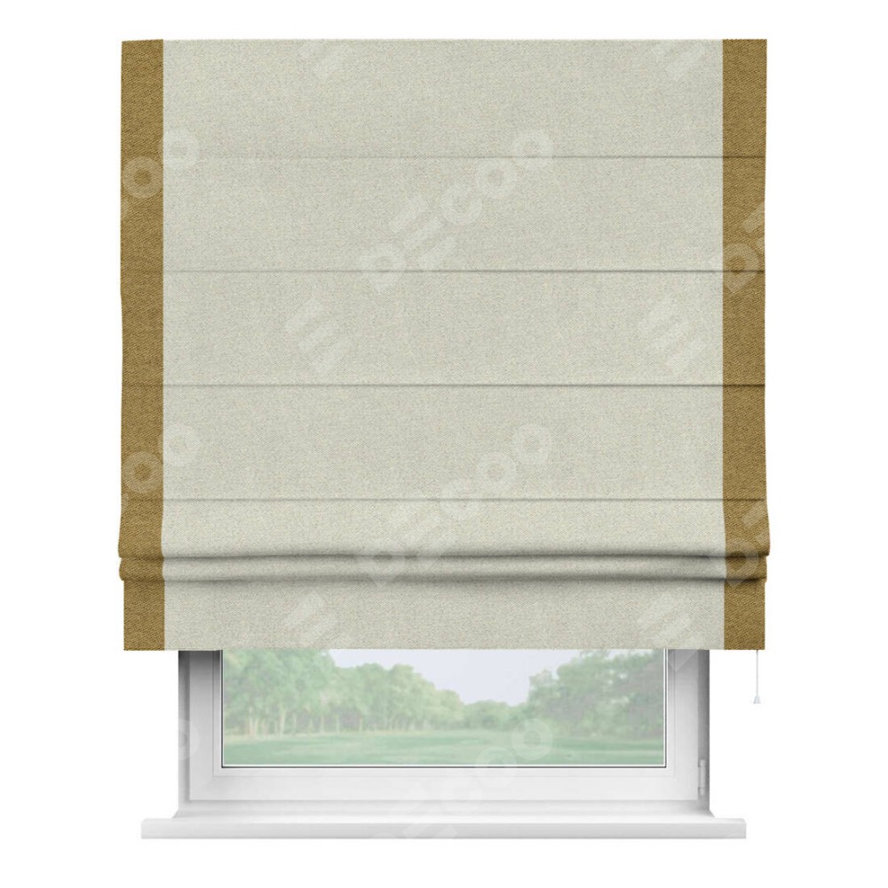 Римская штора пошита из ткани твид блэкаут шампань, артикул: 90929, с отделкой кантом «Стрим Дуо» выделяется наличием кантов по обоим бокам шторы, слева и справа. Этот дизайн придает шторе аккуратный и завершенный вид, акцентируя вертикальные линии и визуально вытягивая окно в высоту. Отделка кантом по бокам не только украшает штору, но и служит практической функцией, укрепляя края и продлевая срок службы изделия.