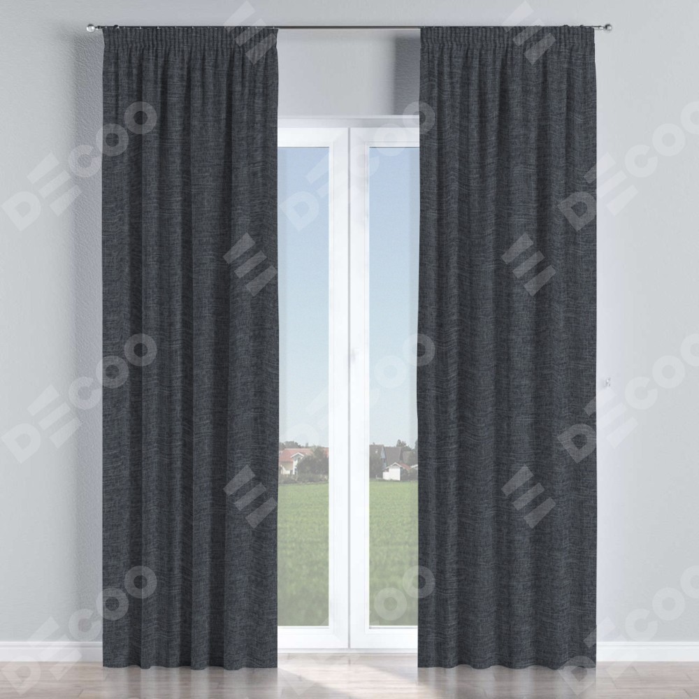 Комплект прямых штор, от производителя «Cortin», пошиты из ткани рогожка димаут графит, артикул ткани 90950. С изнаночной стороны в верхней части штор пристрачивается шторная лента с декоративными складками «Карандаш». Для создания элегантных складок прямые шторы шьются по стандарту с коэффициентом 1:2 (на 100 см. ширины проёма 200 см. ширины ткани).