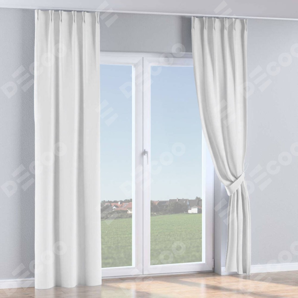Комплект прямых штор, от производителя «Cortin», пошиты из ткани вельвет белоснежный, артикул ткани 92698. С изнаночной стороны в верхней части штор пристрачивается шторная лента с декоративными складками «Кустик». Для создания элегантных складок прямые шторы шьются по стандарту с коэффициентом 1:2 (на 100 см. ширины проёма 200 см. ширины ткани).