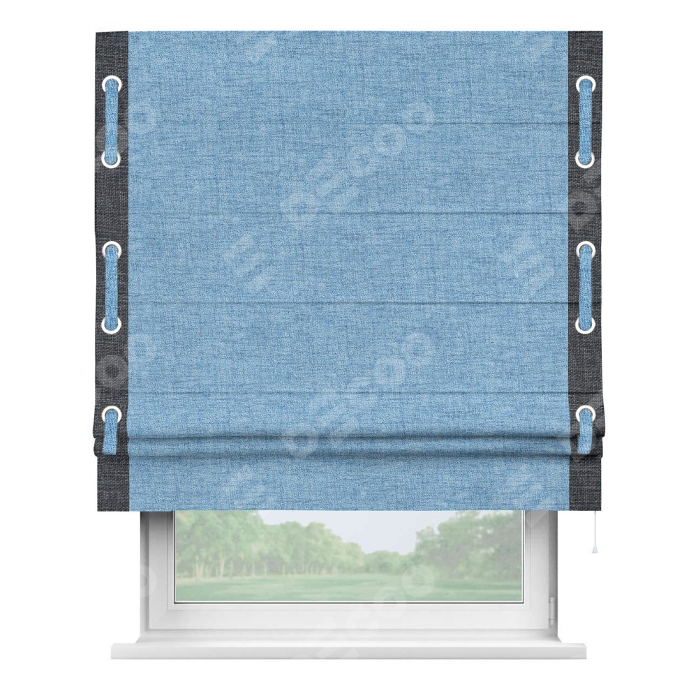 Римская штора пошита из ткани рогожка димаут голубой, артикул: 91025, с отделкой кантом «Стрим Дуо», дополненная декоративными люверсами на этих кантах и протянутым пояском из основного цвета римской шторы, представляет собой высоко декоративное и функциональное решение для оконного оформления. Канты, расположенные по обеим боковым сторонам шторы, уже добавляют изысканности и завершенности внешнему виду. Добавление люверсов и пояска не только усиливает декоративный эффект, но и придает шторе дополнительную текстурность и глубину.