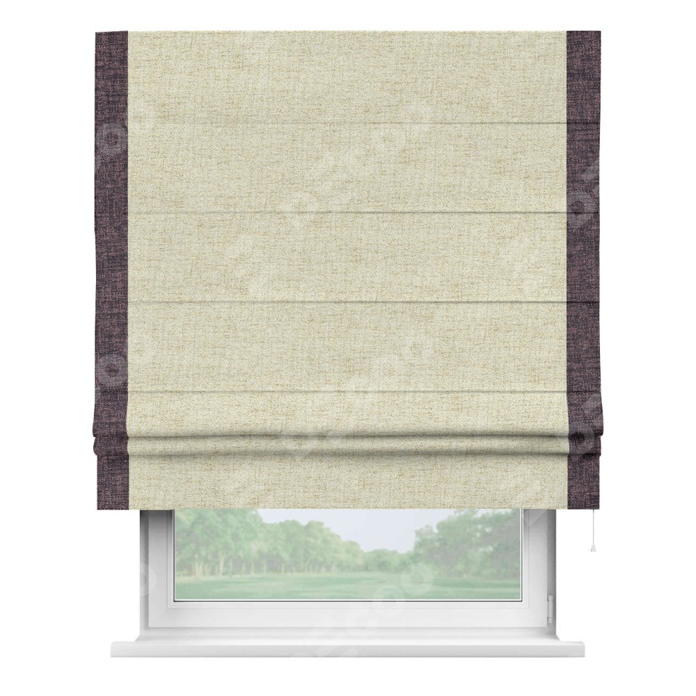 Римская штора пошита из ткани рогожка димаут золотой песок, артикул: 91015, с отделкой кантом «Стрим Дуо» выделяется наличием кантов по обоим бокам шторы, слева и справа. Этот дизайн придает шторе аккуратный и завершенный вид, акцентируя вертикальные линии и визуально вытягивая окно в высоту. Отделка кантом по бокам не только украшает штору, но и служит практической функцией, укрепляя края и продлевая срок службы изделия.