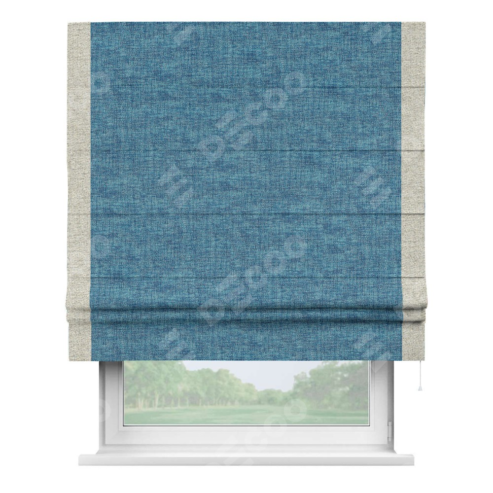 Римская штора пошита из ткани рогожка димаут лазурно-синий, артикул: 91024, с отделкой кантом «Стрим Дуо» выделяется наличием кантов по обоим бокам шторы, слева и справа. Этот дизайн придает шторе аккуратный и завершенный вид, акцентируя вертикальные линии и визуально вытягивая окно в высоту. Отделка кантом по бокам не только украшает штору, но и служит практической функцией, укрепляя края и продлевая срок службы изделия.
