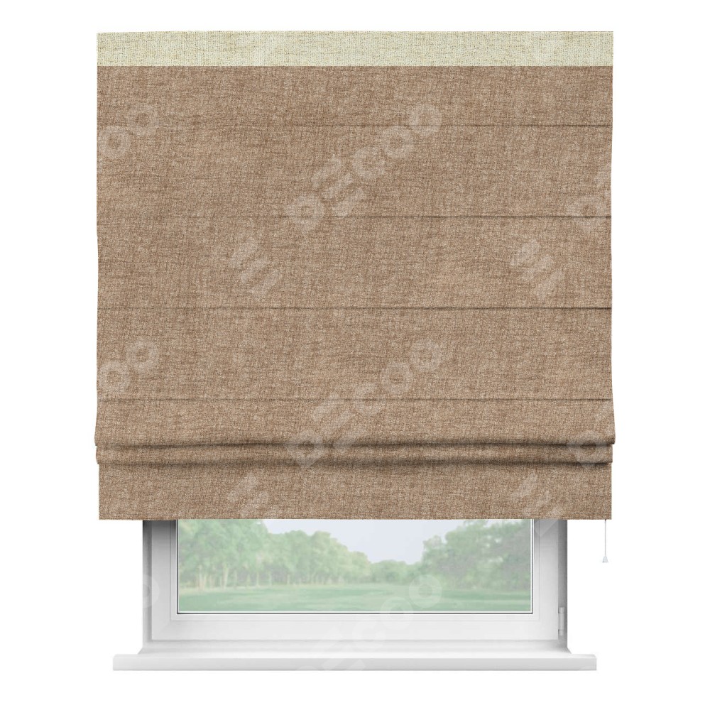 Римская штора пошита из ткани рогожка димаут светло-коричневый, артикул: 91017, с отделкой кантом «Кинг» отличается своей необычной особенностью: кант располагается исключительно сверху шторы. Такой дизайн делает акцент на верхней части окна, визуально поднимая потолок и придавая интерьеру более возвышенный и изысканный вид. Отделка кантом на верхней кромке не только украшает штору, но и может служить дополнительной защитой от износа в месте наибольшего контакта с механизмом управления шторой.