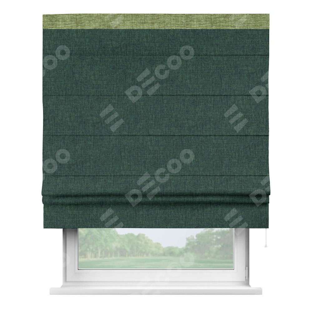 Римская штора пошита из ткани рогожка димаут тёмно-зелёный, артикул: 91022, с отделкой кантом «Кинг» отличается своей необычной особенностью: кант располагается исключительно сверху шторы. Такой дизайн делает акцент на верхней части окна, визуально поднимая потолок и придавая интерьеру более возвышенный и изысканный вид. Отделка кантом на верхней кромке не только украшает штору, но и может служить дополнительной защитой от износа в месте наибольшего контакта с механизмом управления шторой.