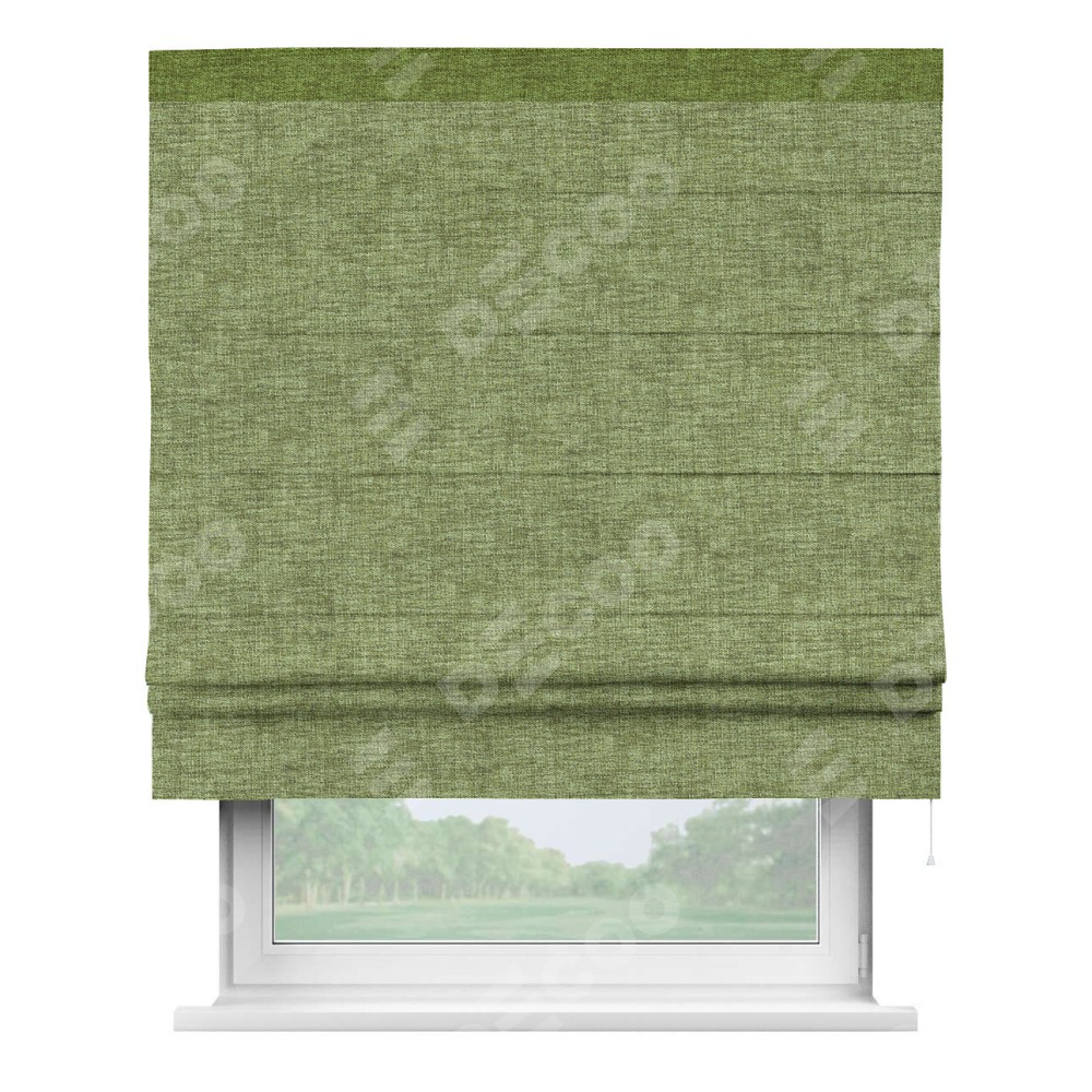 Римская штора пошита из ткани рогожка димаут травяной, артикул: 91021, с отделкой кантом «Кинг» отличается своей необычной особенностью: кант располагается исключительно сверху шторы. Такой дизайн делает акцент на верхней части окна, визуально поднимая потолок и придавая интерьеру более возвышенный и изысканный вид. Отделка кантом на верхней кромке не только украшает штору, но и может служить дополнительной защитой от износа в месте наибольшего контакта с механизмом управления шторой.