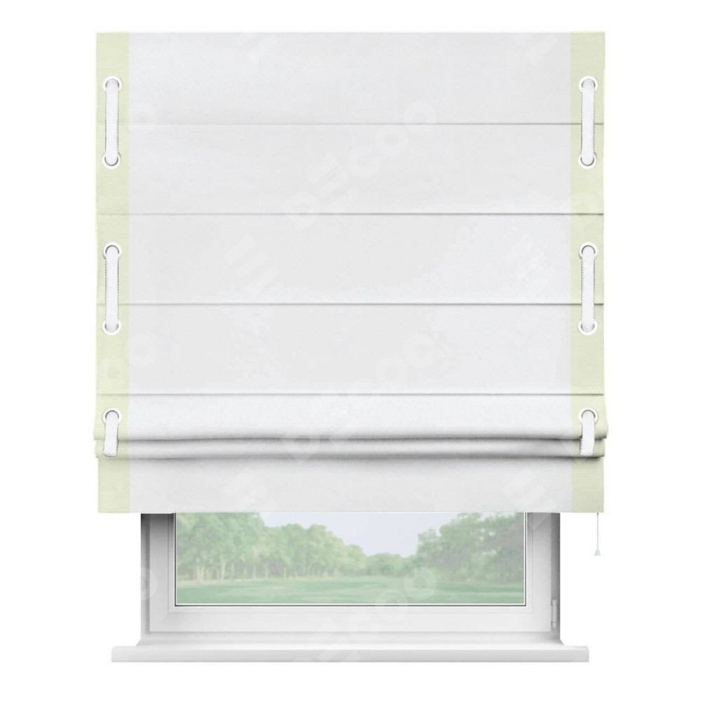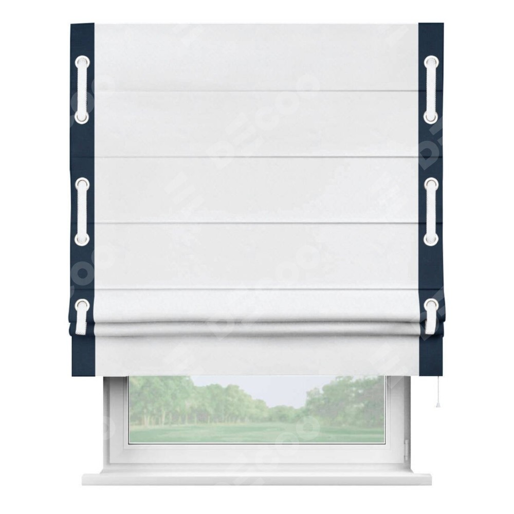Римская штора пошита из ткани вельвет белоснежный, артикул: 92698, с отделкой кантом «Стрим Дуо», дополненная декоративными люверсами на этих кантах и протянутым пояском из основного цвета римской шторы, представляет собой высоко декоративное и функциональное решение для оконного оформления. Канты, расположенные по обеим боковым сторонам шторы, уже добавляют изысканности и завершенности внешнему виду. Добавление люверсов и пояска не только усиливает декоративный эффект, но и придает шторе дополнительную текстурность и глубину.