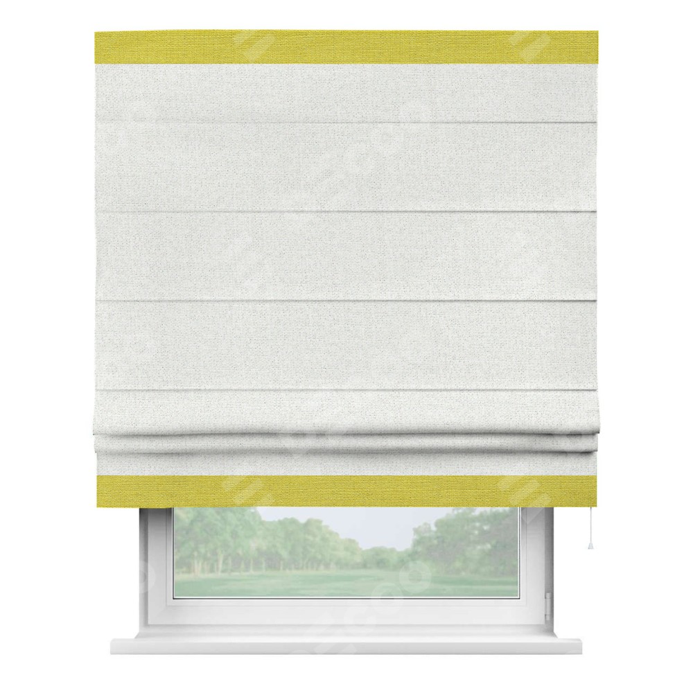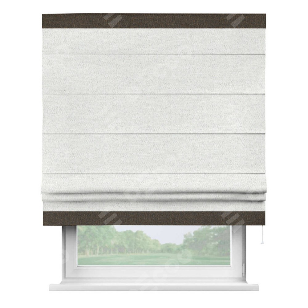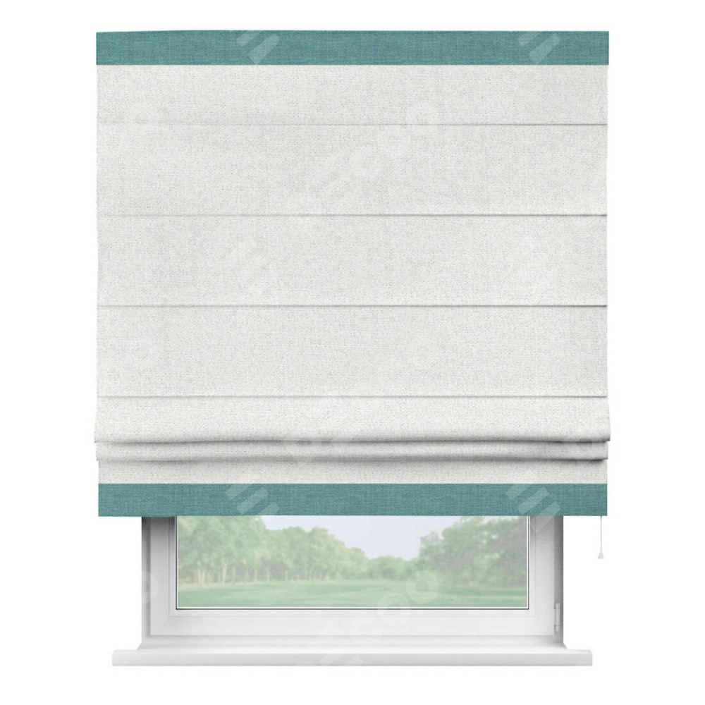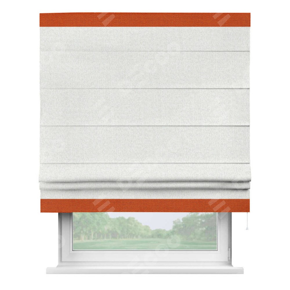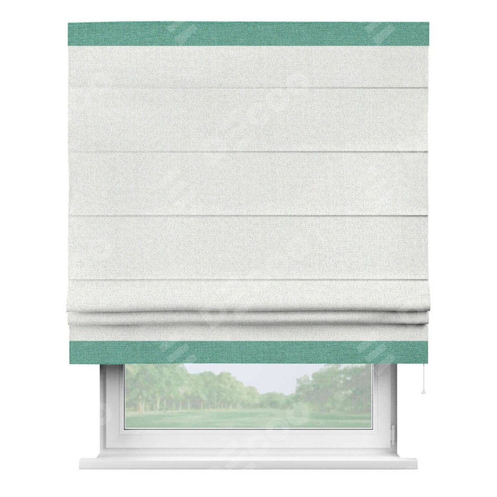 Римская штора пошита из ткани лён шампань, артикул: 91399, с отделкой кантом «Горизонт» предлагает уникальное дизайнерское решение, при котором кант располагается только вверху и снизу шторы. Такое решение делает акцент на горизонтальных линиях, визуально расширяя пространство и придавая окну более строгий и организованный вид. Отделка кантом в этих ключевых местах не только украшает штору, но и способствует её долговечности, защищая наиболее уязвимые к износу края.