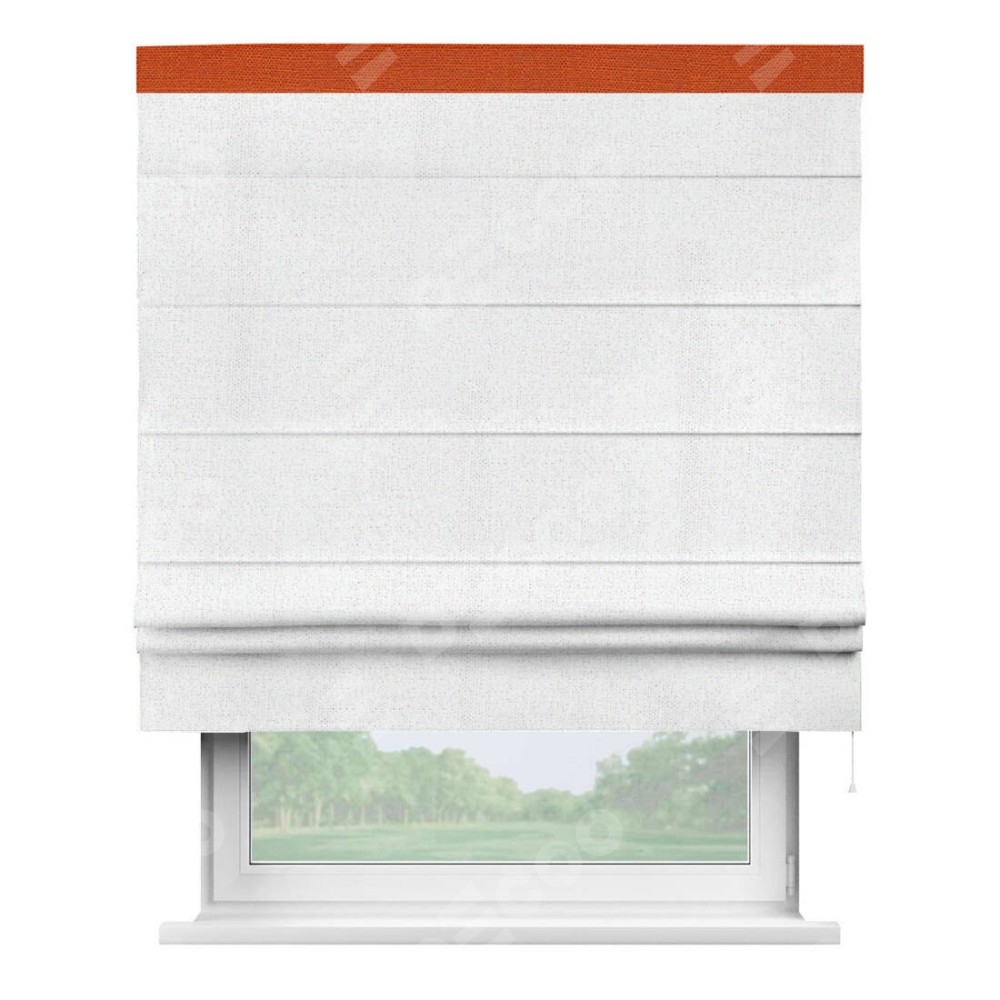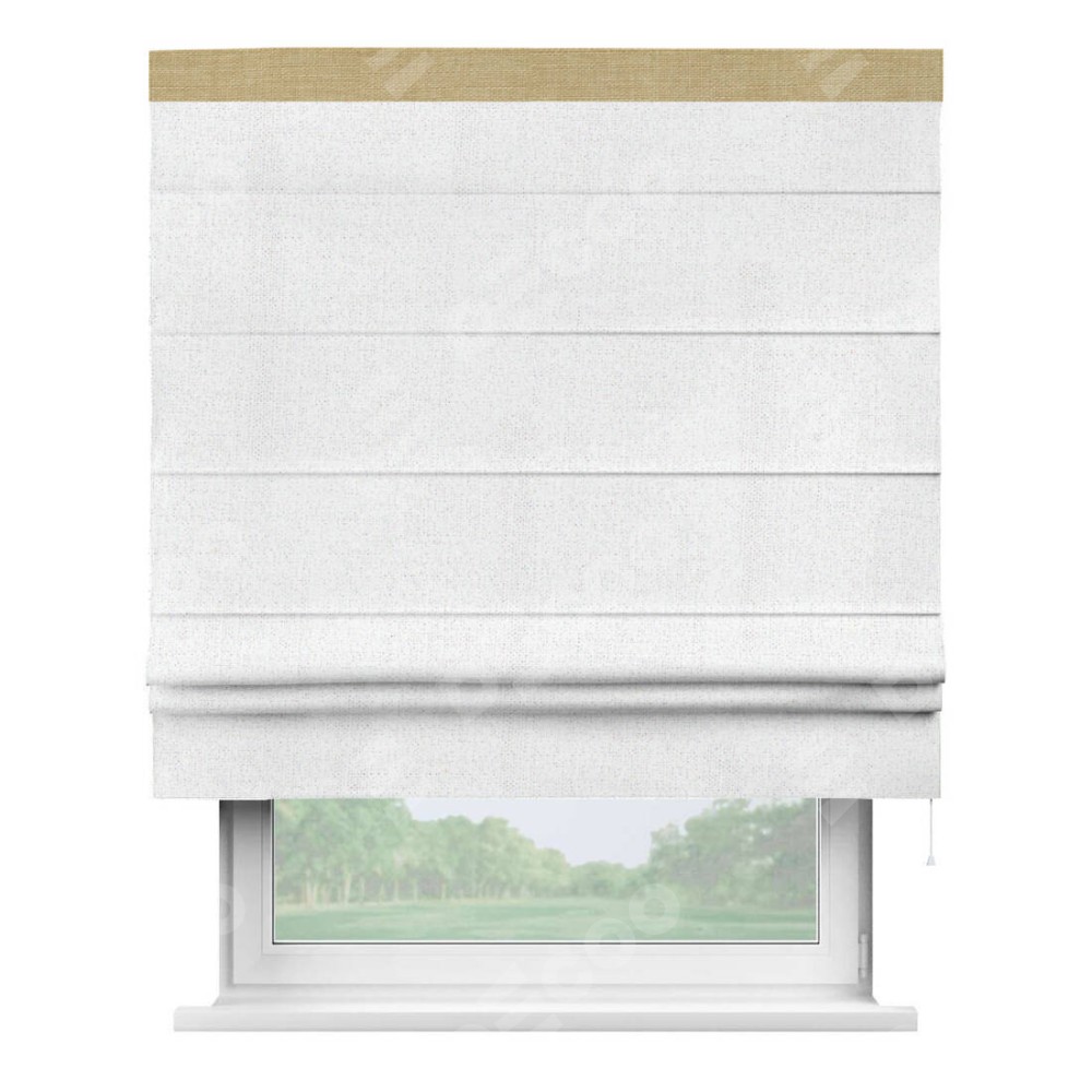 Римская штора пошита из ткани лён белоснежный, артикул: 95632, с отделкой кантом «Кинг» отличается своей необычной особенностью: кант располагается исключительно сверху шторы. Такой дизайн делает акцент на верхней части окна, визуально поднимая потолок и придавая интерьеру более возвышенный и изысканный вид. Отделка кантом на верхней кромке не только украшает штору, но и может служить дополнительной защитой от износа в месте наибольшего контакта с механизмом управления шторой.