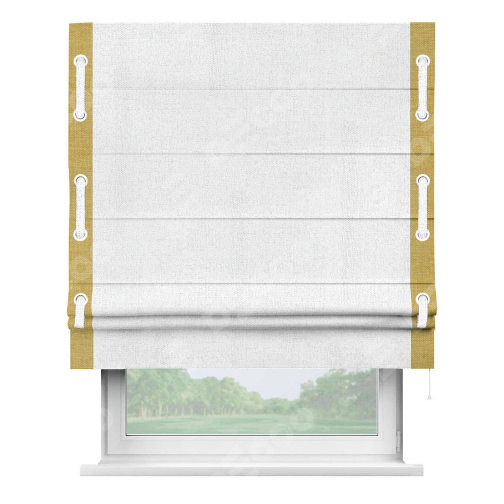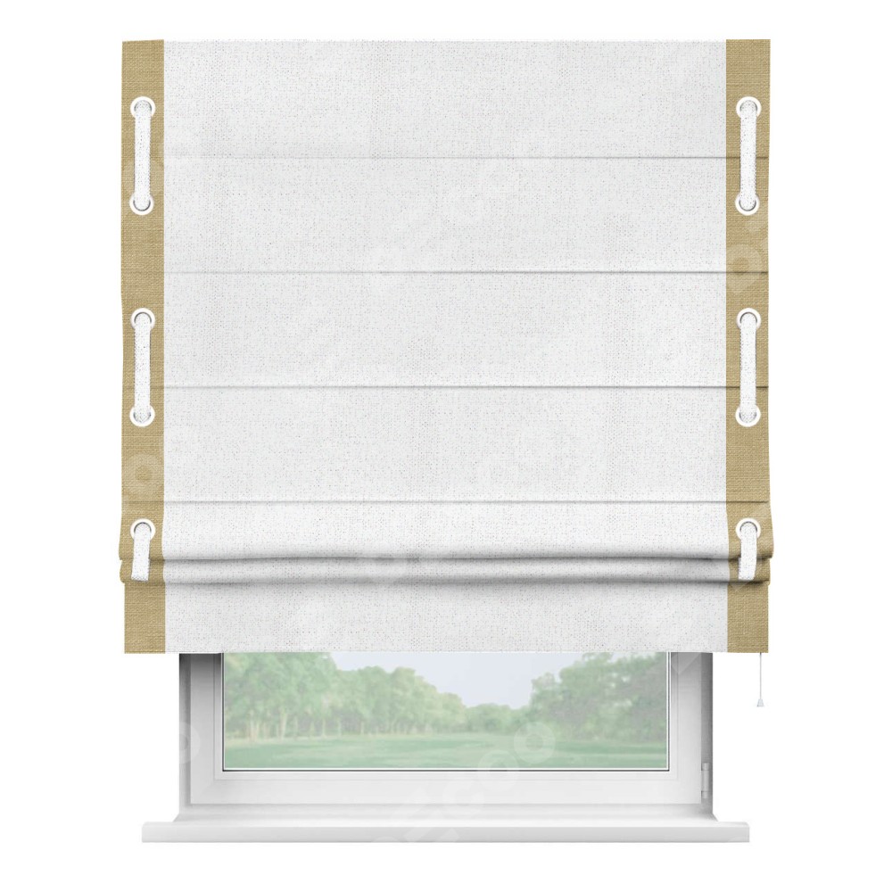 Римская штора пошита из ткани лён белоснежный, артикул: 95632, с отделкой кантом «Стрим Дуо», дополненная декоративными люверсами на этих кантах и протянутым пояском из основного цвета римской шторы, представляет собой высоко декоративное и функциональное решение для оконного оформления. Канты, расположенные по обеим боковым сторонам шторы, уже добавляют изысканности и завершенности внешнему виду. Добавление люверсов и пояска не только усиливает декоративный эффект, но и придает шторе дополнительную текстурность и глубину.