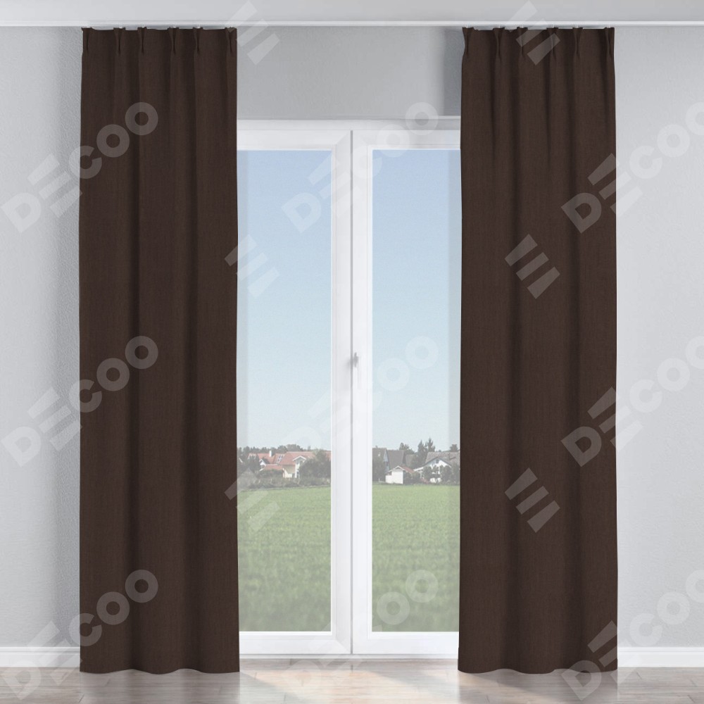 Комплект прямых штор, от производителя «Cortin», пошиты из ткани лён димаут венге, артикул ткани 91001. С изнаночной стороны в верхней части штор пристрачивается шторная лента с декоративными складками «Кустик». Для создания элегантных складок прямые шторы шьются по стандарту с коэффициентом 1:2 (на 100 см. ширины проёма 200 см. ширины ткани).