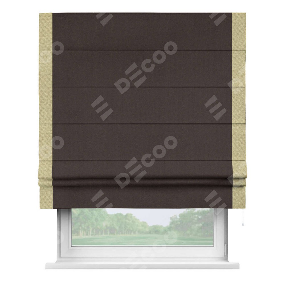 Римская штора пошита из ткани лён димаут венге, артикул: 91001, с отделкой кантом «Стрим Дуо» выделяется наличием кантов по обоим бокам шторы, слева и справа. Этот дизайн придает шторе аккуратный и завершенный вид, акцентируя вертикальные линии и визуально вытягивая окно в высоту. Отделка кантом по бокам не только украшает штору, но и служит практической функцией, укрепляя края и продлевая срок службы изделия.