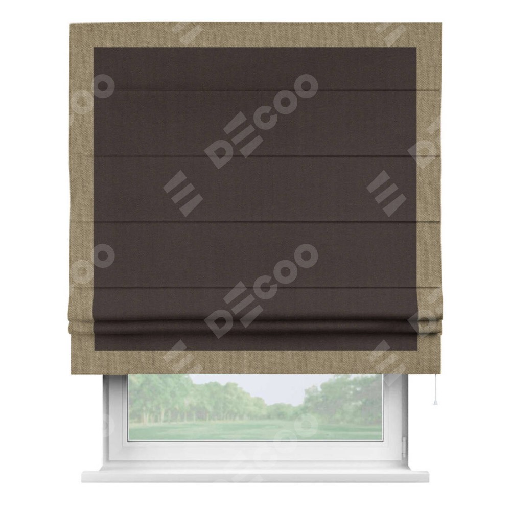 Римская штора пошита из ткани лён димаут венге, артикул: 91001, с отделкой кантом «Чесс» отличается своей уникальной деталью — наличием канта не только по бокам и снизу, но и сверху по всем краям шторы. Это придает шторе особенно аккуратный и завершенный вид, делая акцент на границах и форме шторы. Отделка кантом по всему периметру шторы усиливает её декоративные качества и подчеркивает строгую геометрию, что может быть особенно актуально для современных и минималистичных интерьеров.