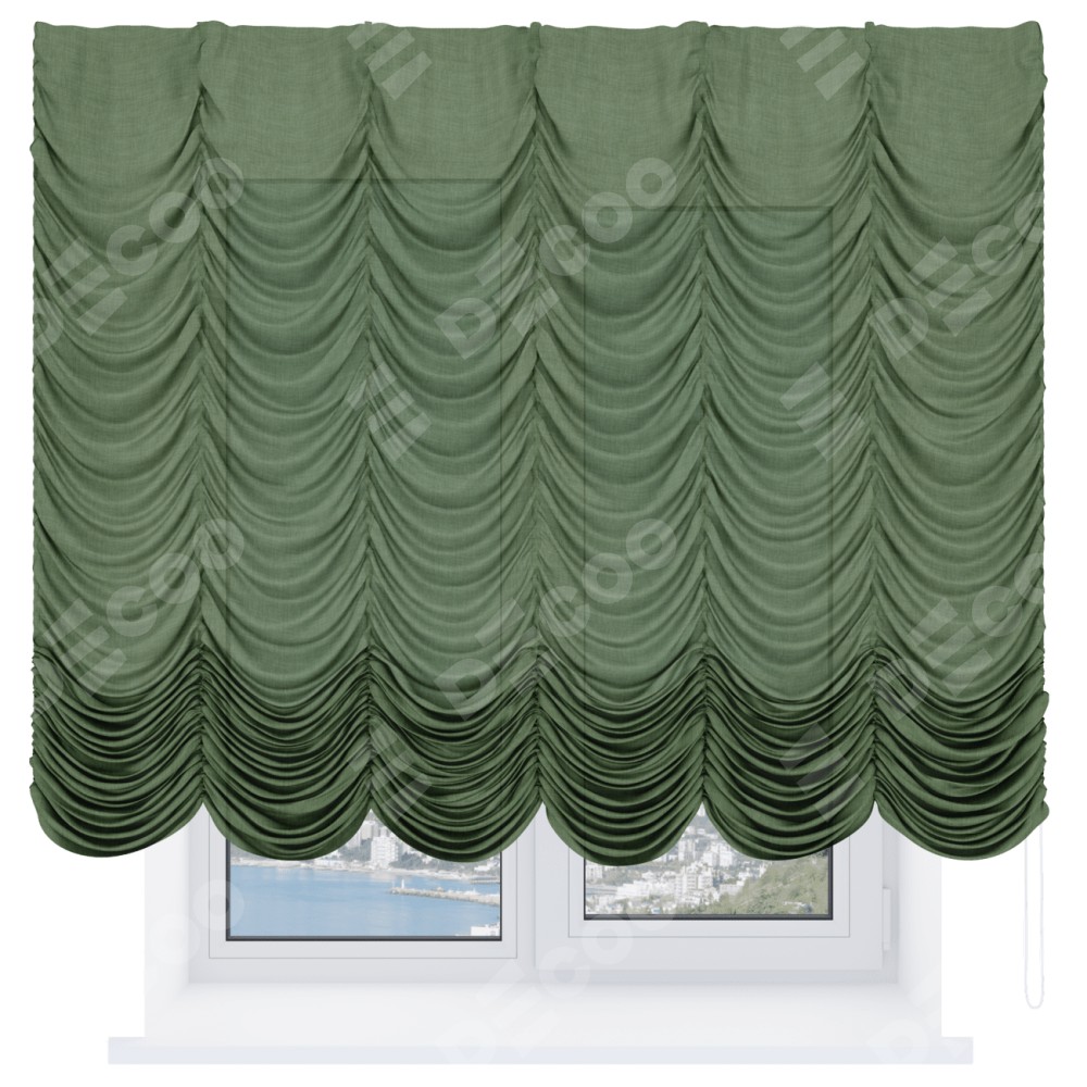 Французская штора производителя «Cortin», используется для проёма, пошита из ткани лён зелёный, артикул ткани 131547. Имеет универсальный механизм и подходит для монтажа: на потолок и на стену.