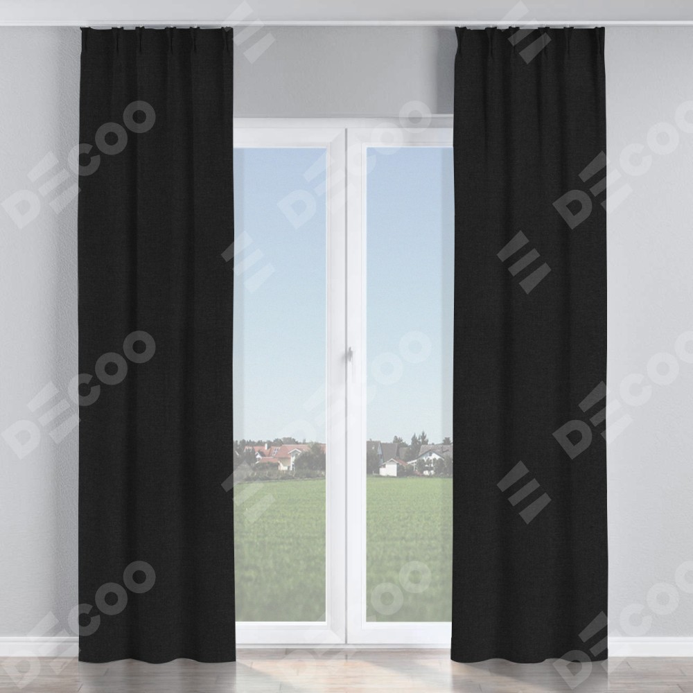 Комплект прямых штор, от производителя «Cortin», пошиты из ткани лён черный, артикул ткани 140815. С изнаночной стороны в верхней части штор пристрачивается шторная лента с декоративными складками «Кустик». Для создания элегантных складок рекомендуемый коэффициент 1:2 (на 100 см. ширины проёма 200 см. ширины ткани). Важно! Ширина штор указана без учёта коэффициента сборки!