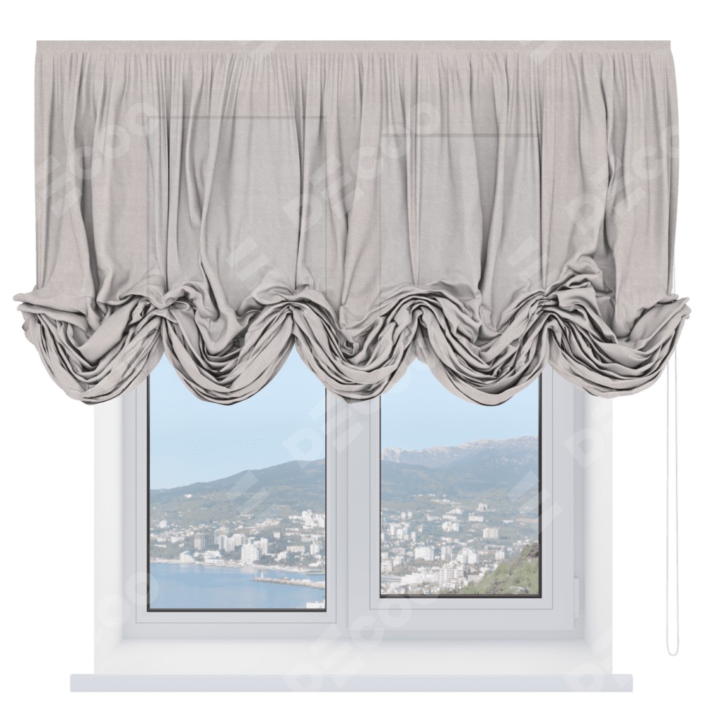 Австрийская штора производителя «Cortin», используется для проёма, пошита из ткани лён кашемир натуральный беж. Имеет универсальный механизм и подходит для монтажа: на потолок и на стену.