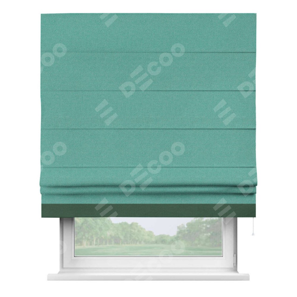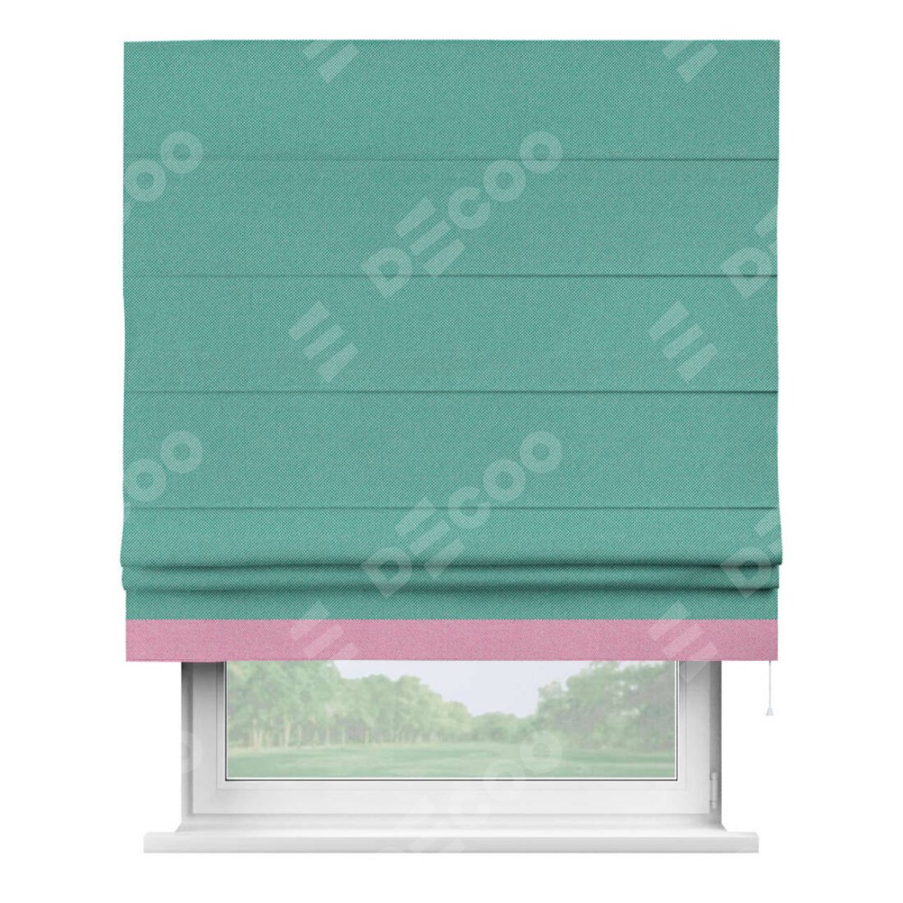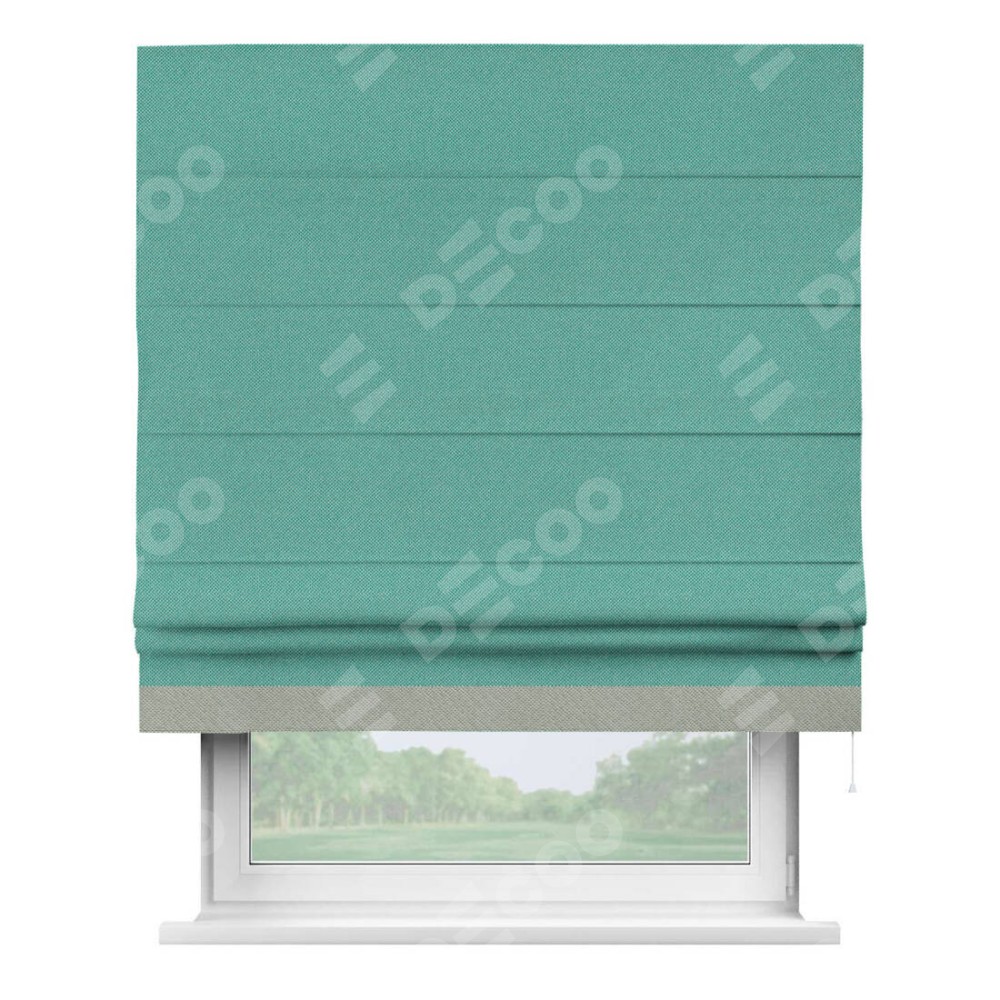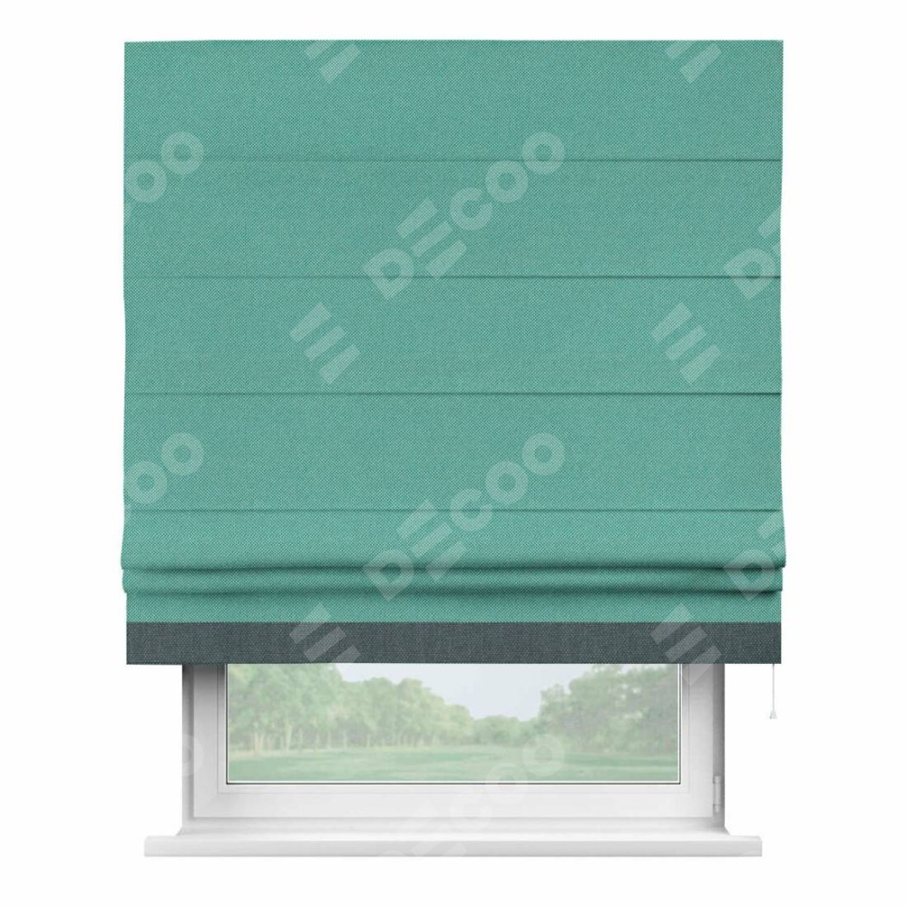 Римская штора производителя «Cortin», используется для проёма, пошита из ткани лён димаут бирюзовый, артикул 23. Отделка шторы кантом «Джестер», ткань для канта используется из льна димаут разной расцветки на выбор. Имеет универсальный механизм и подходит для монтажа: на потолок, на стену и в нишу.