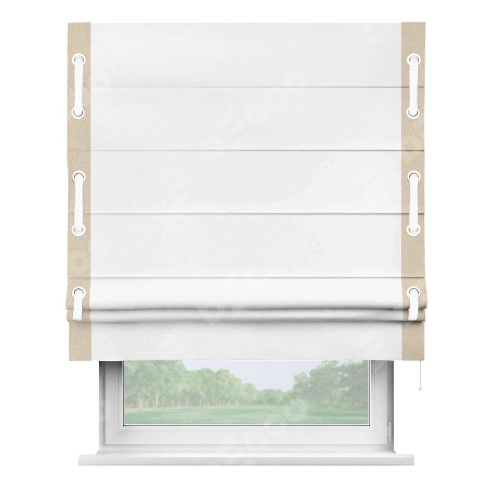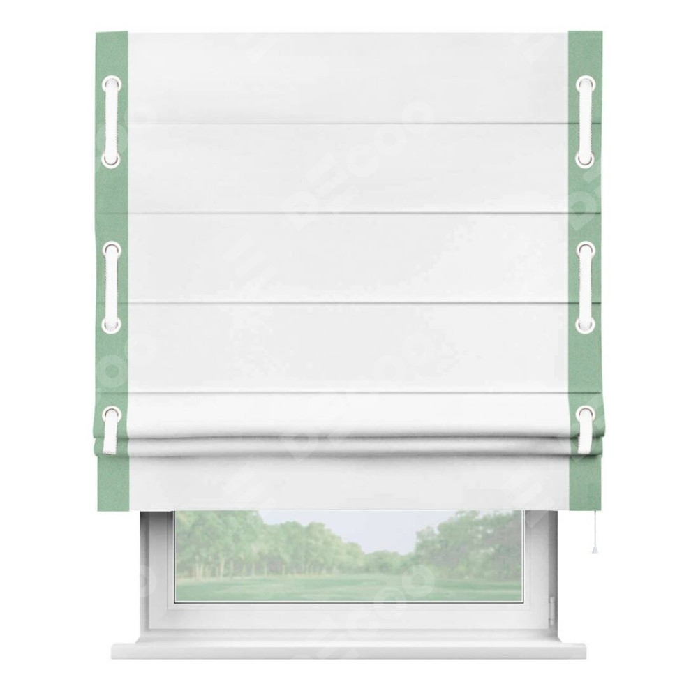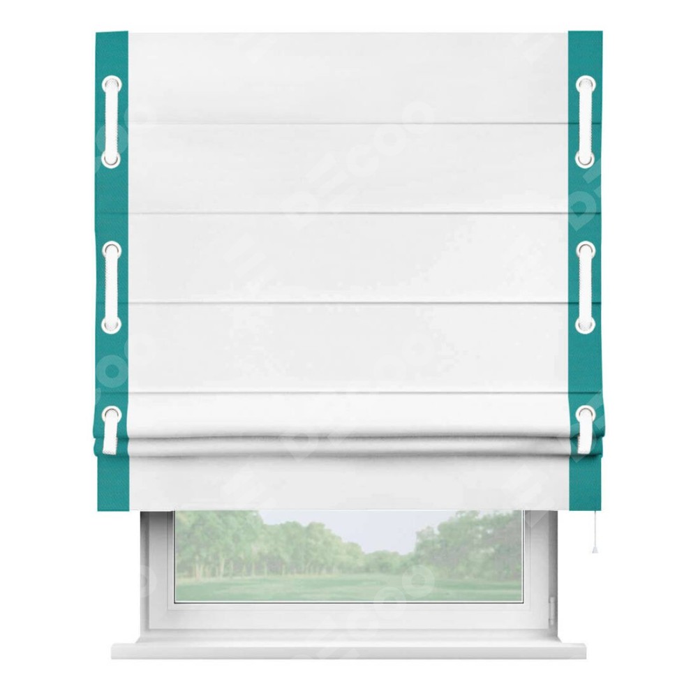 Римская штора «Кортин» для проёма, вайтаут однотонная белая с кантом Стрим Дуо (люверсы с пояском)