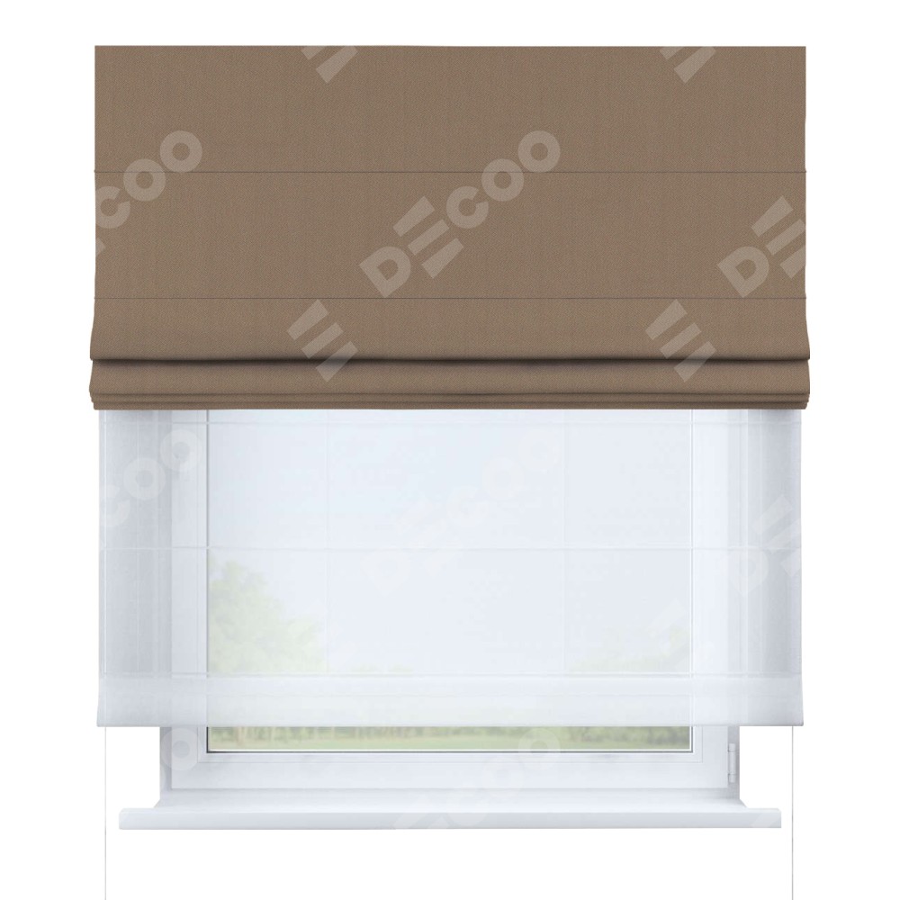 Двойная римская штора «День-ночь» от производителя Cortin предназначена для использования в проёмах. Эта штора уникальна тем, что состоит из двух полотен. На лицевой стороне находится однотонный блэкаут кофейно-бежевый (артикул: 91566−2), обеспечивающий эффективное затемнение. В комплект также входит вторая ткань — легкий белый тюль (артикул: V-01), который добавляет изящества и легкости оформлению окна. Кроме того, доступны и другие разновидности ткани тюль, выбор которых доступен по ссылке .