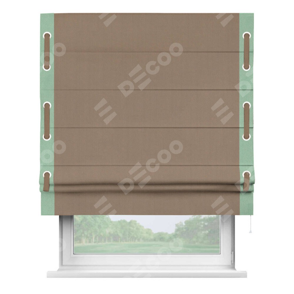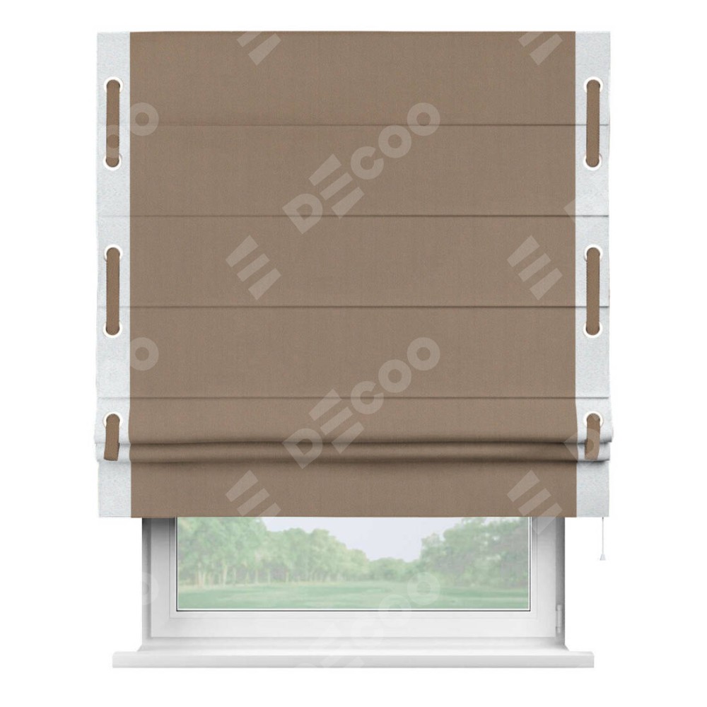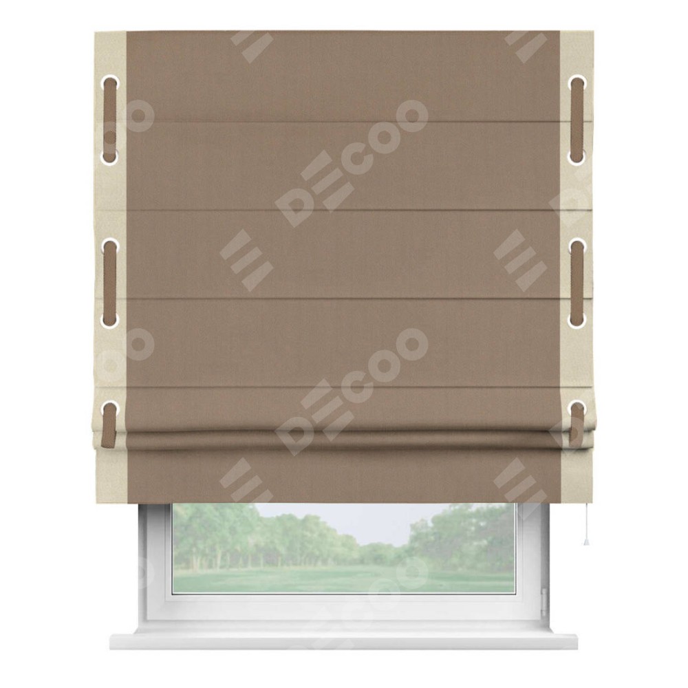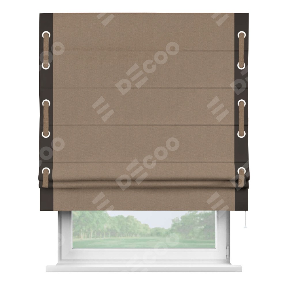 Римская штора «Cortin» для проёма, ткань блэкаут однотонный кофейно-бежевый с кантом Стрим Дуо (люверсы с пояском)