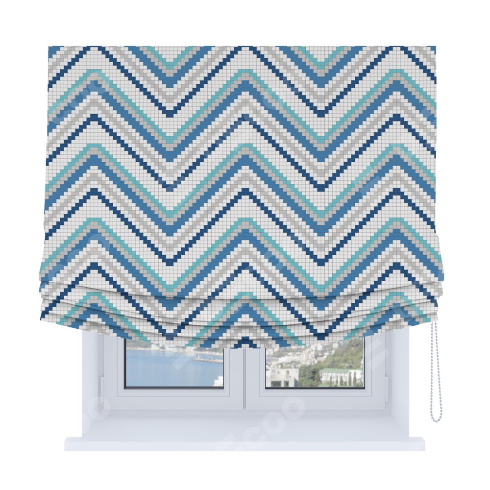 Классическая римская штора производителя «Cortin», пошита из ткани геометрическая волна, артикул:. Имеет универсальный механизм и подходит для монтажа: на потолок, на стену и в нишу.