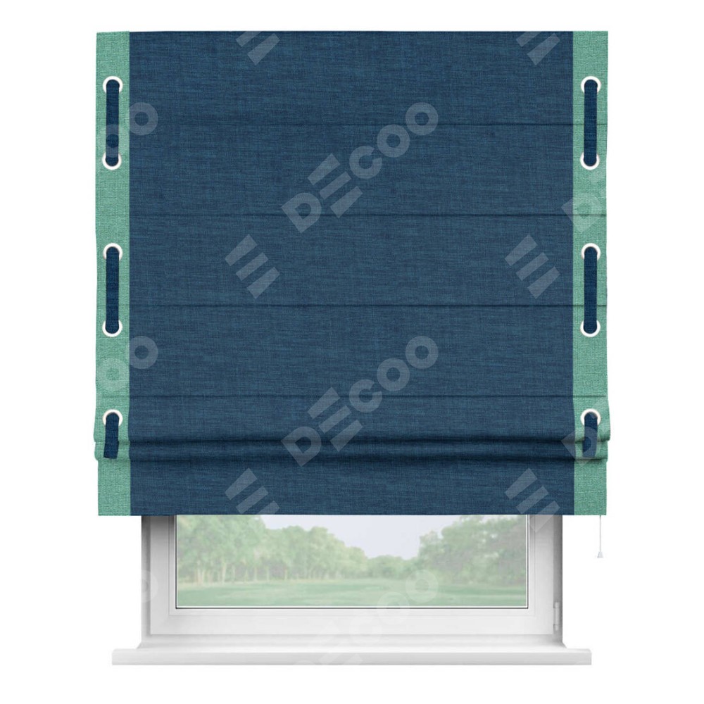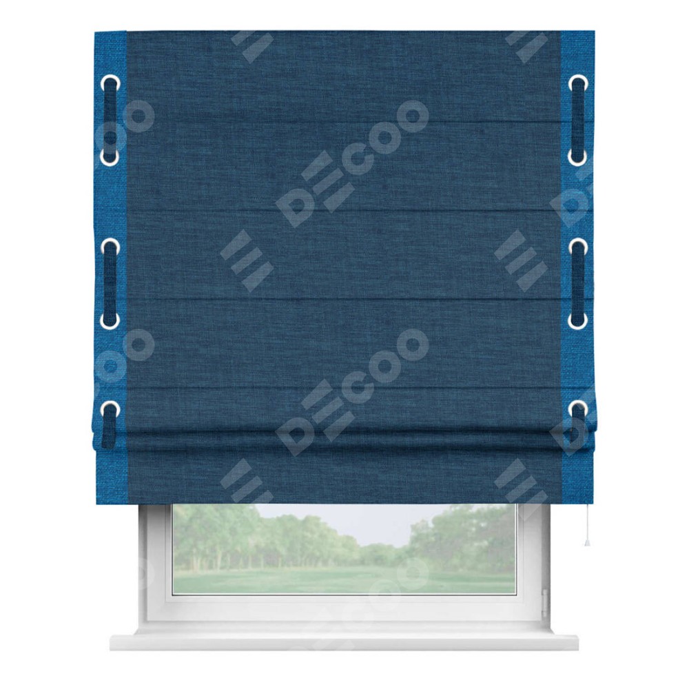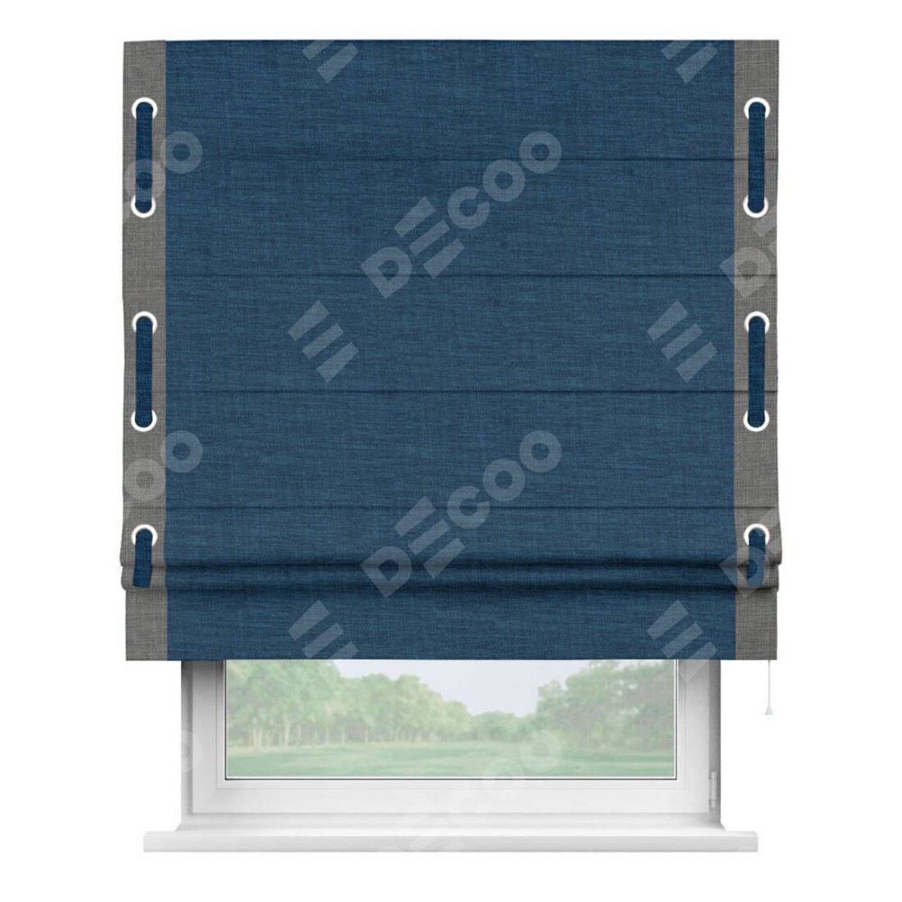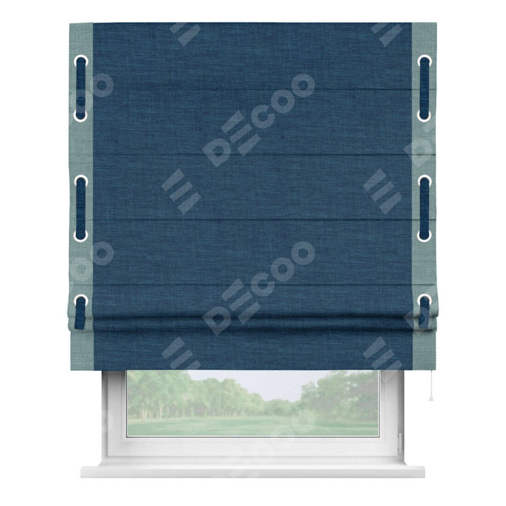 Римская штора «Кортин» для проёма, лён синий, с кантом Стрим Дуо (люверсы с пояском)