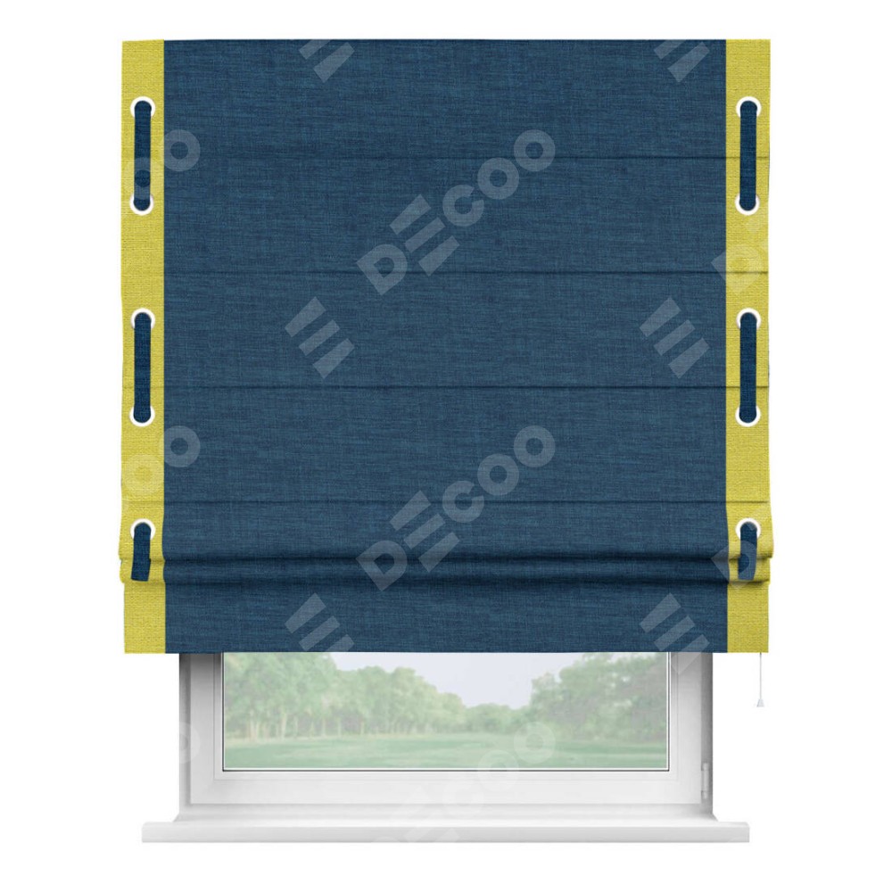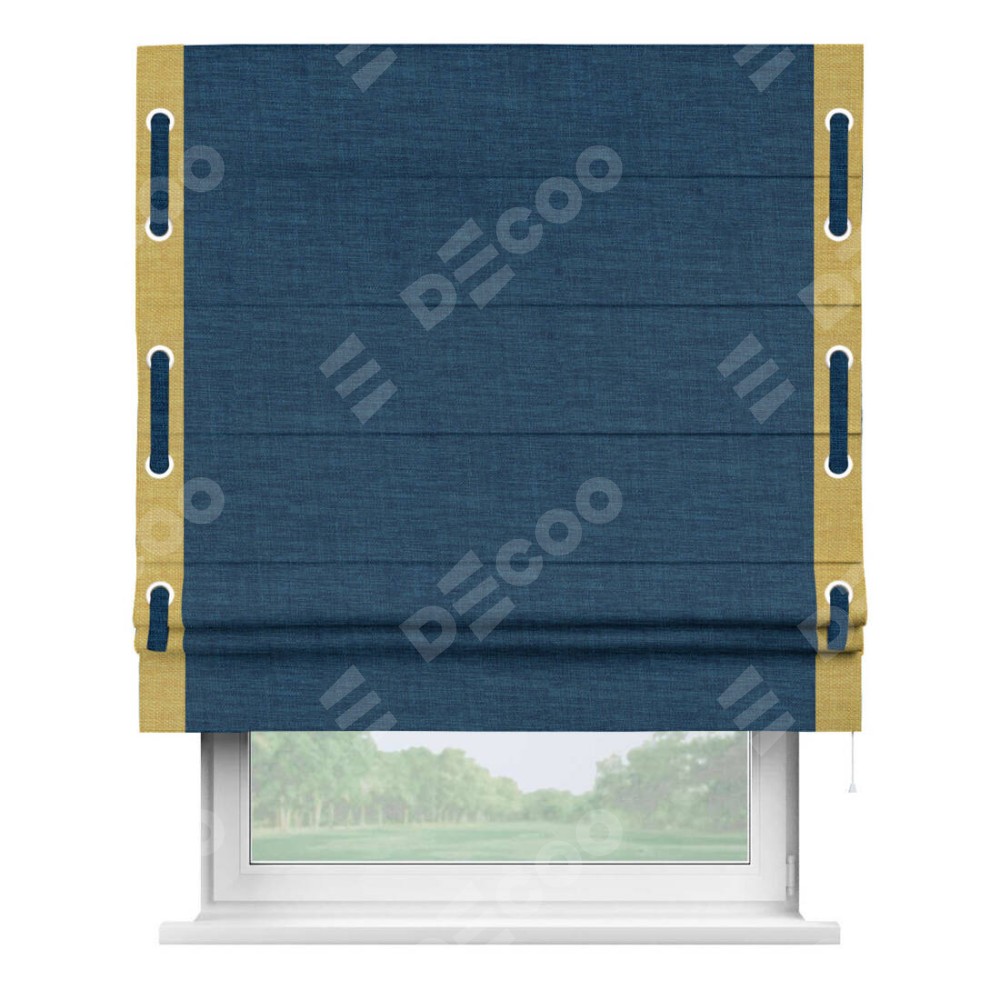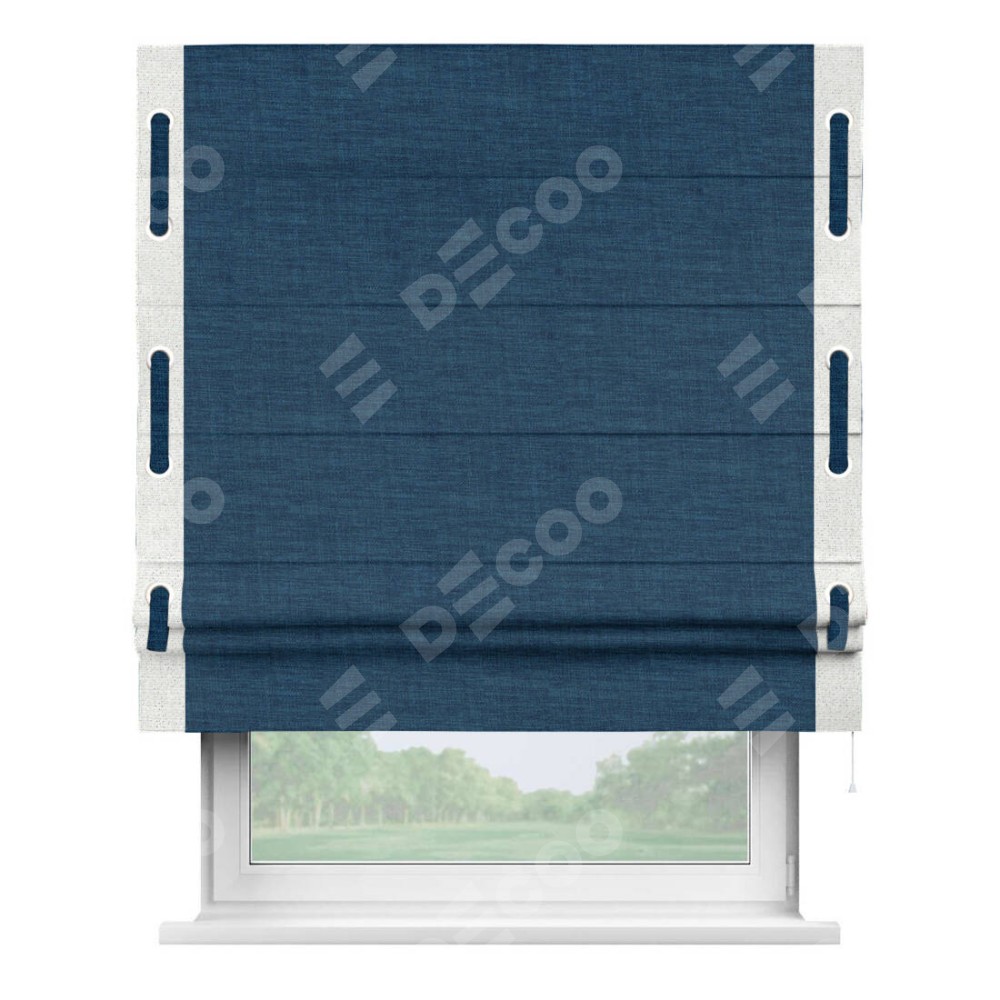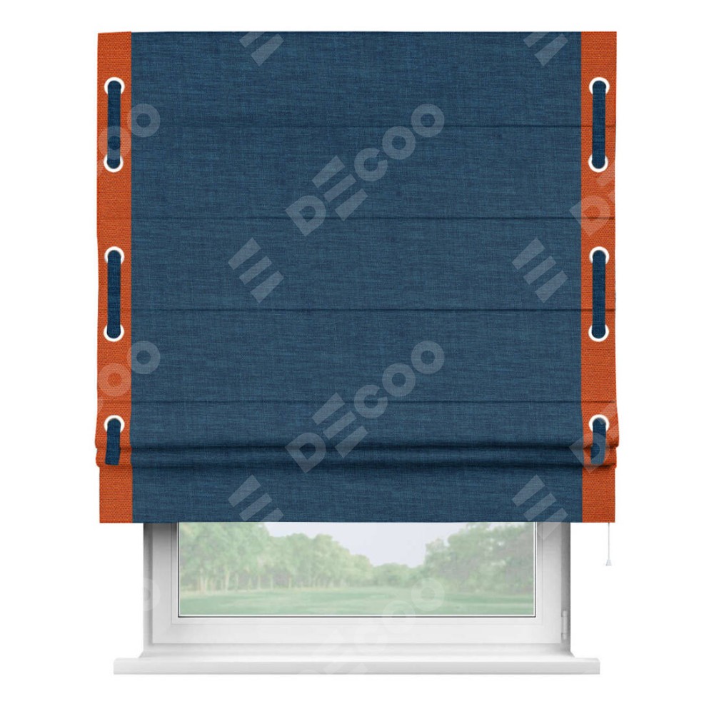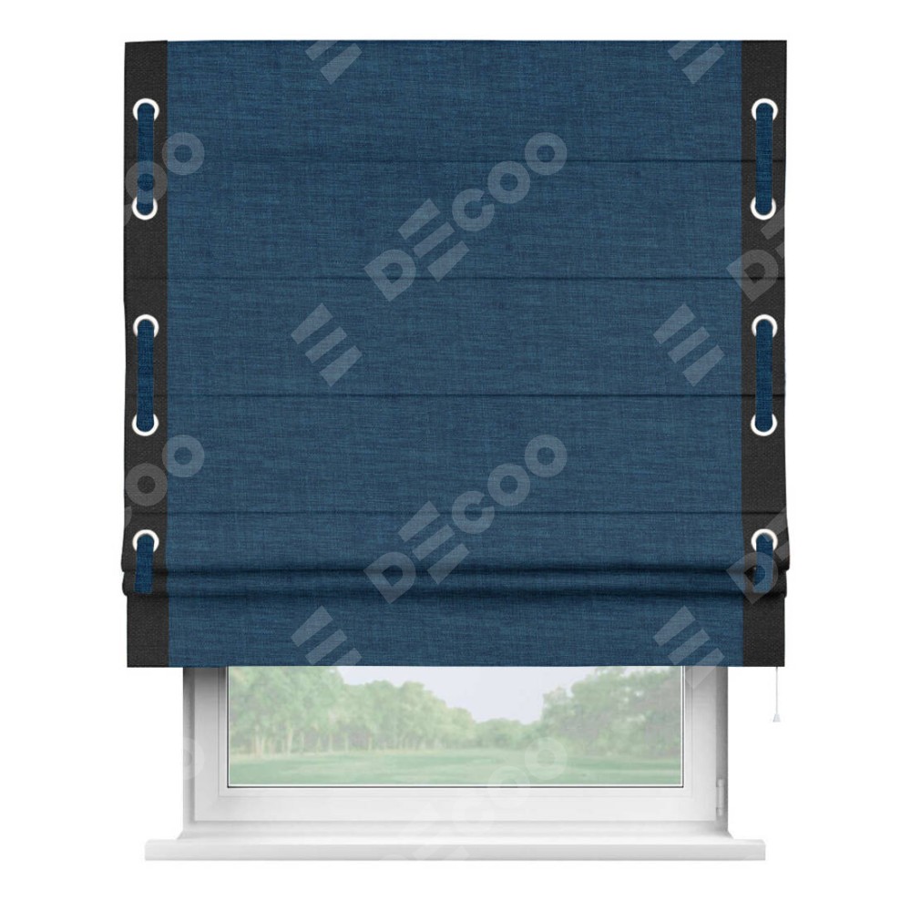 Римская штора «Кортин» для проёма, лён синий, с кантом Стрим Дуо (люверсы с пояском)