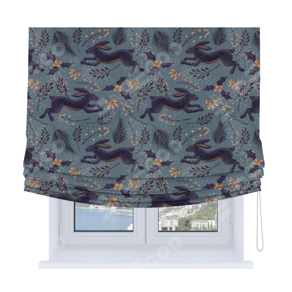 Классическая римская штора производителя «Cortin», пошита из ткани дарк арт зайцы, артикул:. Имеет универсальный механизм и подходит для монтажа: на потолок, на стену и в нишу.