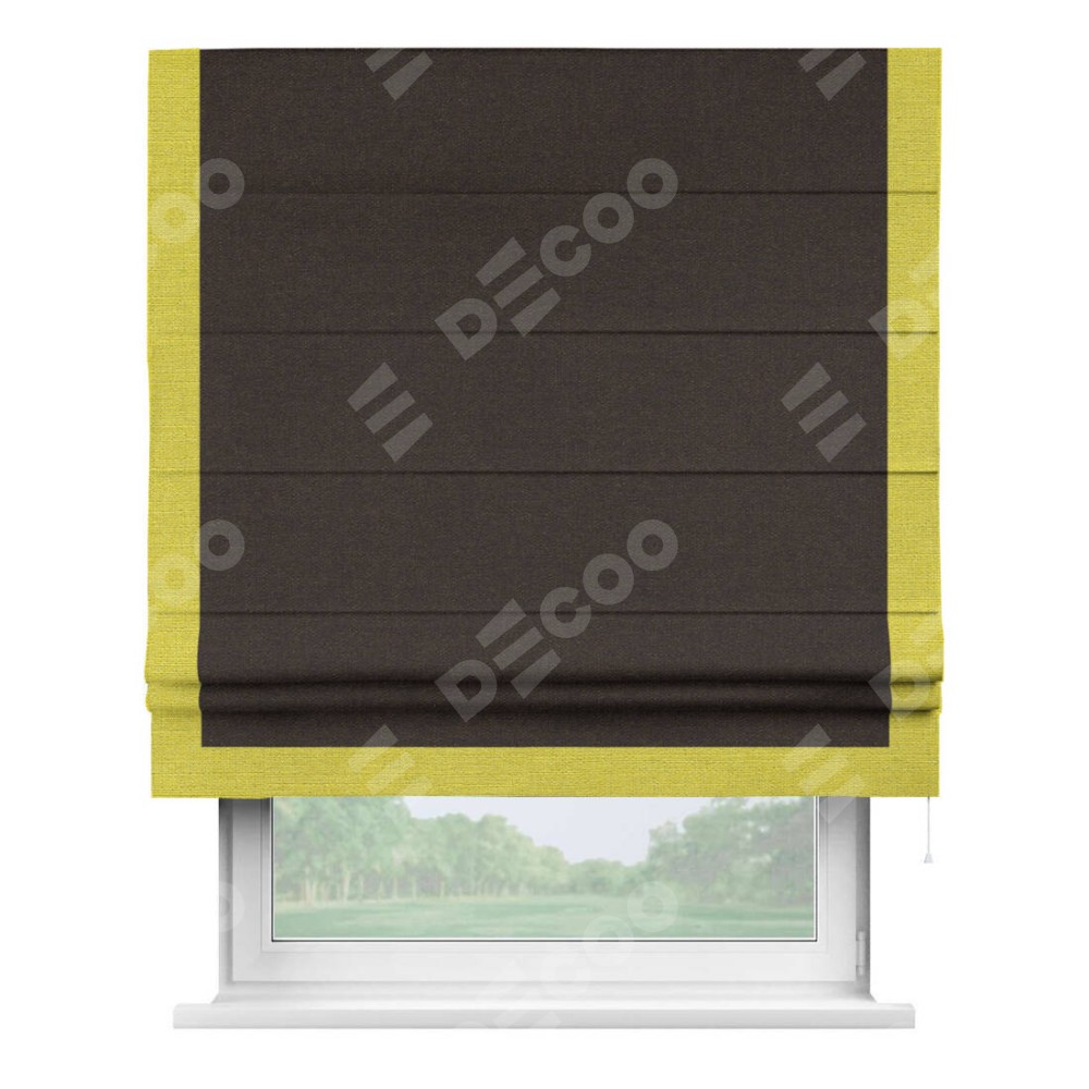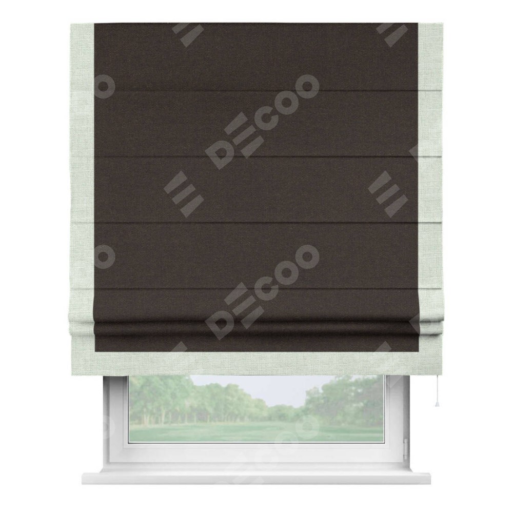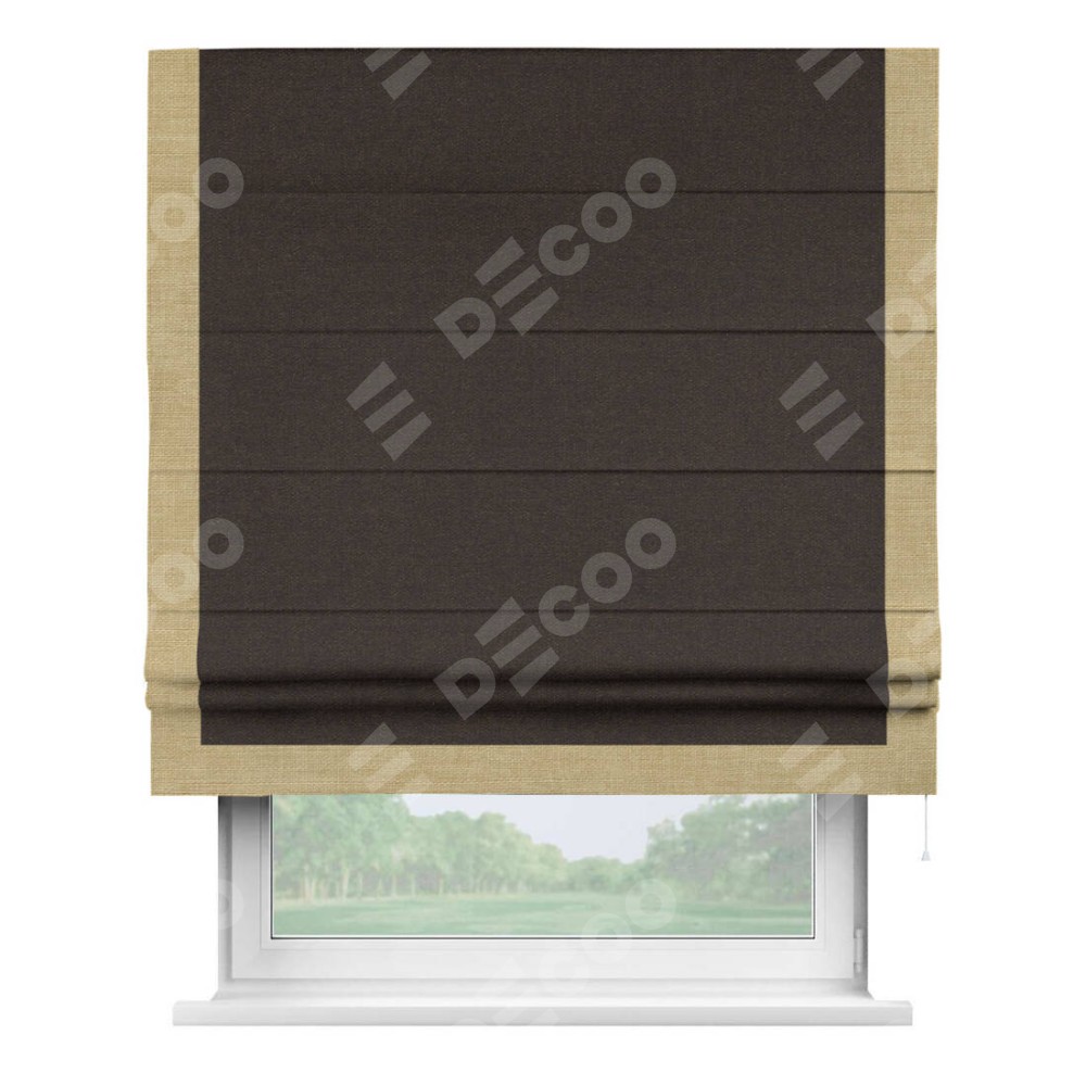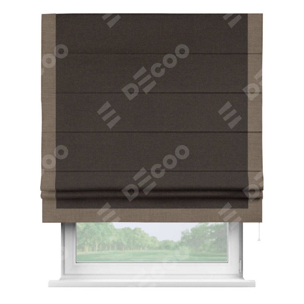 Классическая римская штора производителя «Cortin», пошита из ткани лён тёмно-коричневый, артикул: 104497. Имеет универсальный механизм и подходит для монтажа: на потолок, на стену и в нишу.