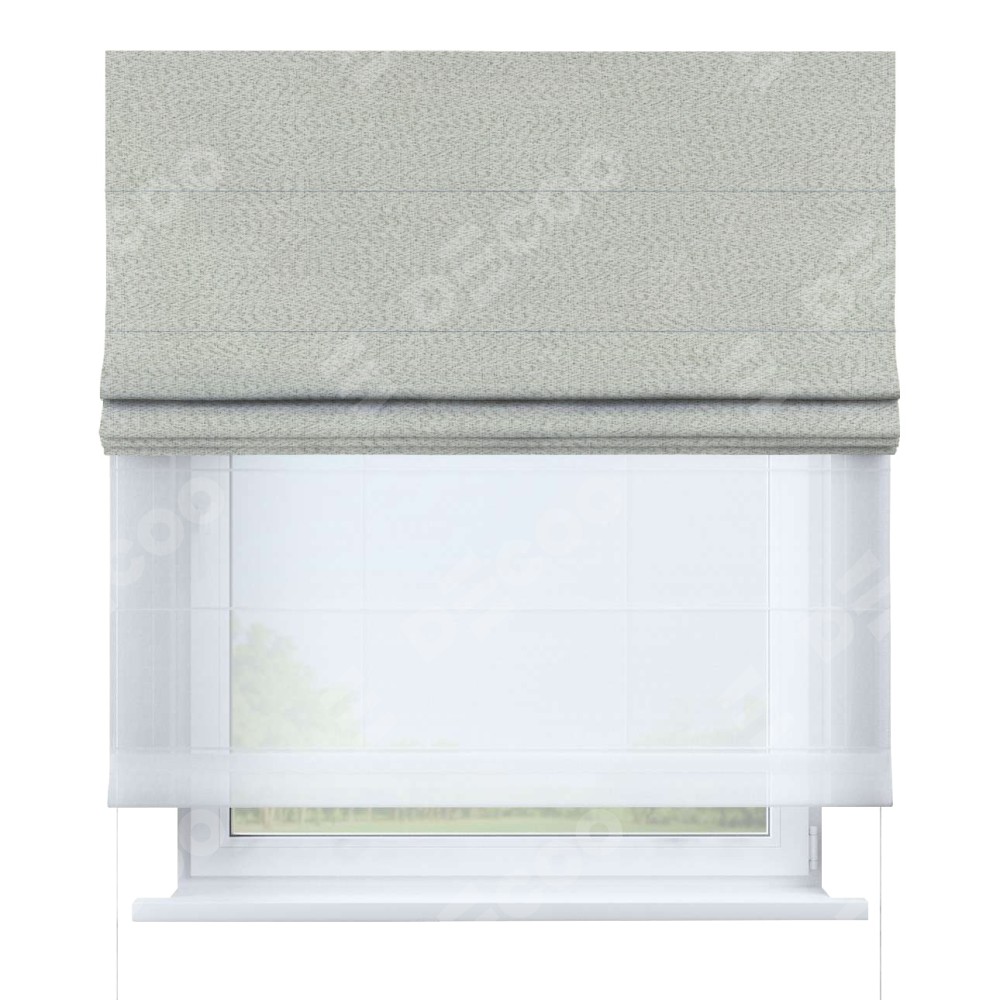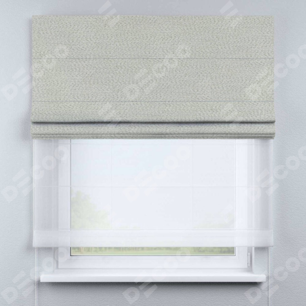 Двойная римская штора «День-ночь» от производителя Cortin предназначена для использования в проёмах. Эта штора уникальна тем, что состоит из двух полотен. На лицевой стороне находится лён рустик светло-бежевый (артикул: 87673), обеспечивающий эффективное затемнение. В комплект также входит вторая ткань — легкий белый тюль (артикул: V-01), который добавляет изящества и легкости оформлению окна. Кроме того, доступны и другие разновидности ткани тюль, выбор которых доступен по  ссылке .