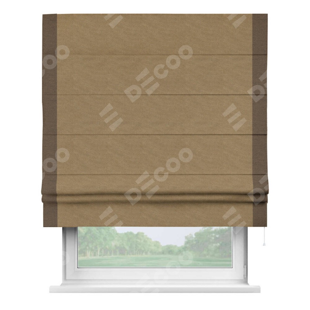 Римская штора производителя «Cortin», используется для проёма, пошита из ткани лён димаут коричневый, артикул 83026. Отделка шторы кантом «Стрим Дуо», ткань для канта используется из льна димаут разной расцветки на выбор. Имеет универсальный механизм и подходит для монтажа: на потолок, на стену и в нишу.