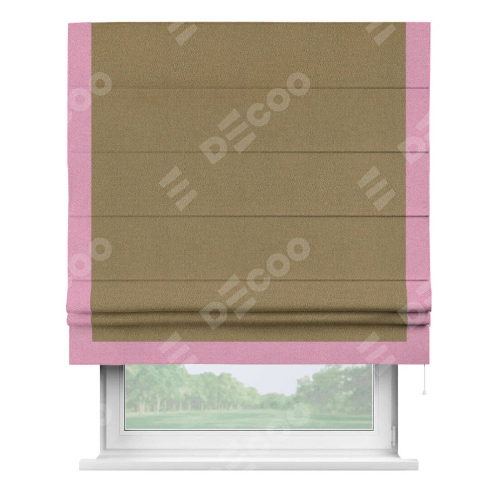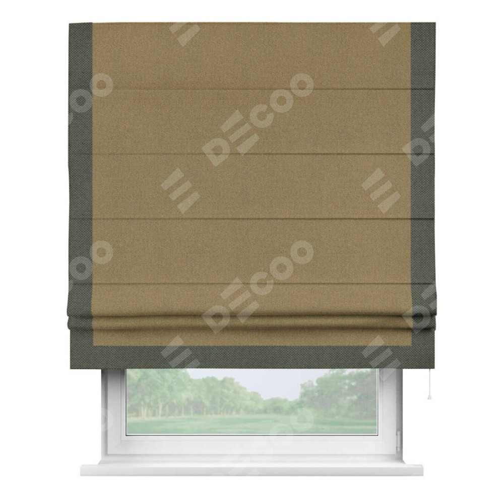 Римская штора производителя «Cortin», используется для проёма, пошита из ткани лён димаут оливковый, артикул 16243. Отделка шторы кантом «Виктория», ткань для канта используется из льна димаут разной расцветки на выбор. Имеет универсальный механизм и подходит для монтажа: на потолок, на стену и в нишу.