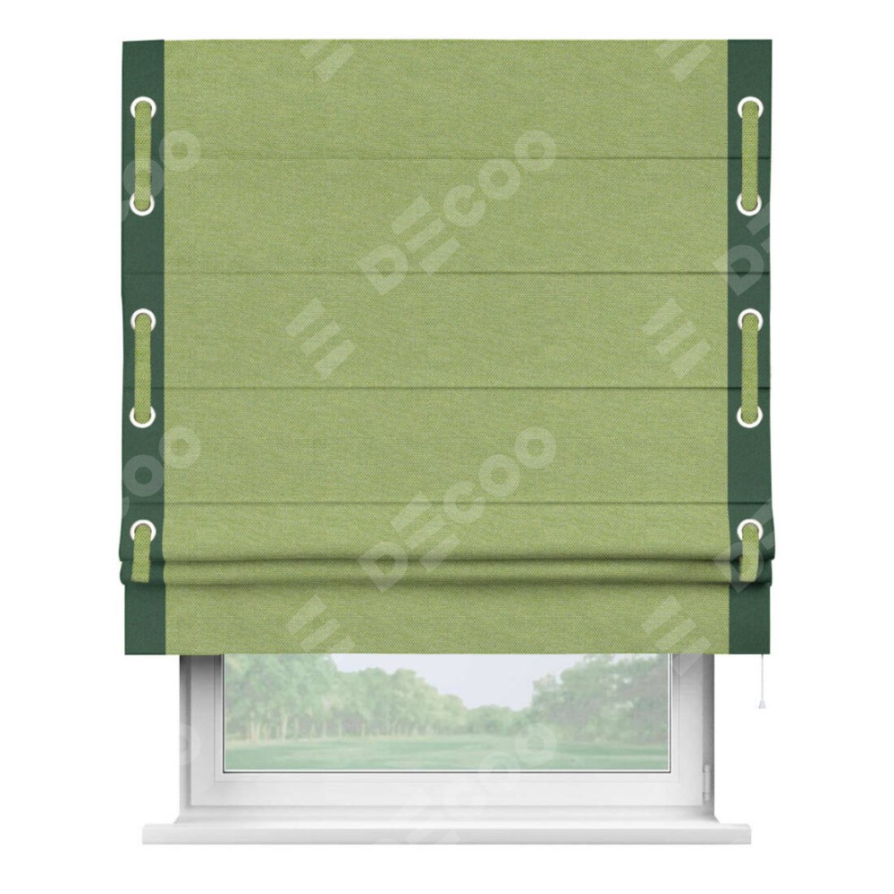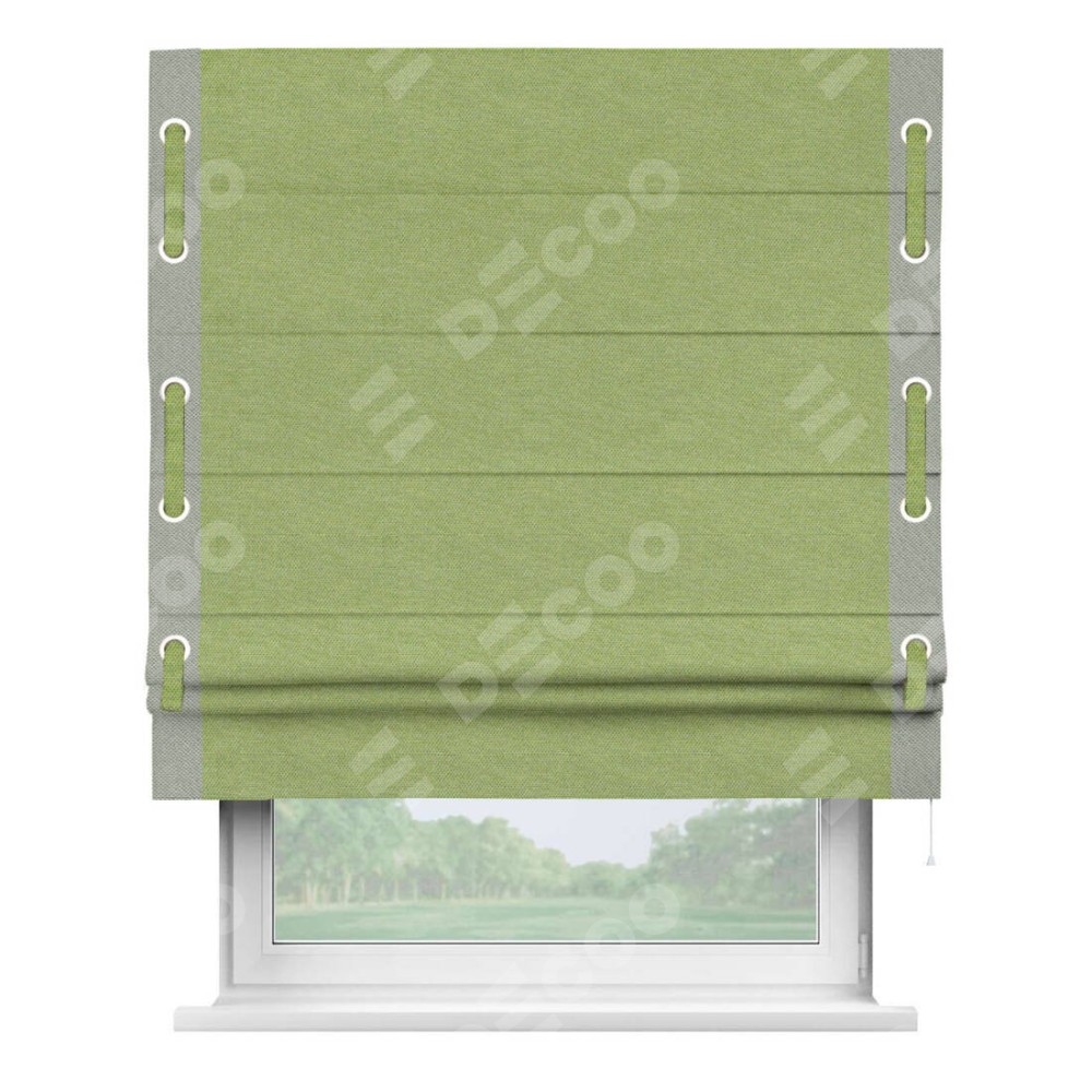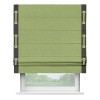 Римская штора производителя «Cortin», используется для проёма, пошита из ткани лён димаут салатовый, артикул 83032. Отделка шторы кантом «Стрим Дуо» на кантах расположены люверсы с пояском, ткань для канта используется лён димаут разной расцветки на выбор. Ткань для пояска обычно используется из основной ткани шторы, а так же можно сделать из любой расцветки по желанию. Имеет универсальный механизм и подходит для монтажа: на потолок, на стену и в нишу.