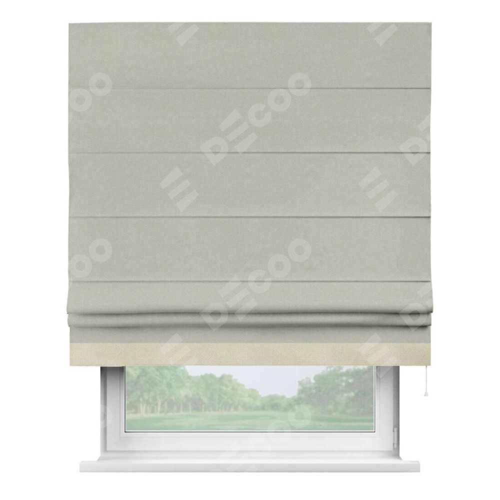 Римская штора производителя «Cortin», используется для проёма, пошита из ткани лён димаут светло-серый, артикул 83025. Отделка шторы кантом «Джестер», ткань для канта используется из льна димаут разной расцветки на выбор. Имеет универсальный механизм и подходит для монтажа: на потолок, на стену и в нишу.