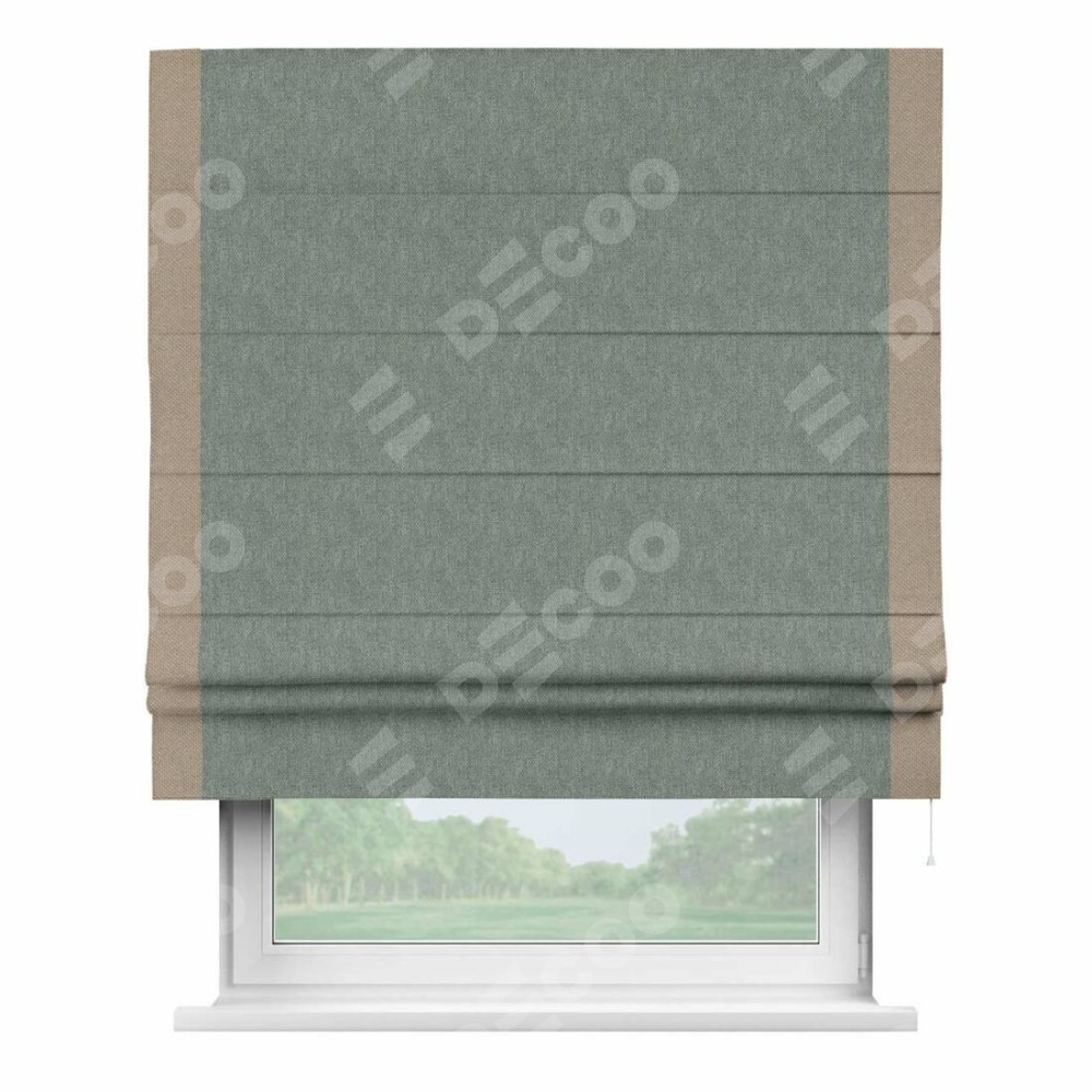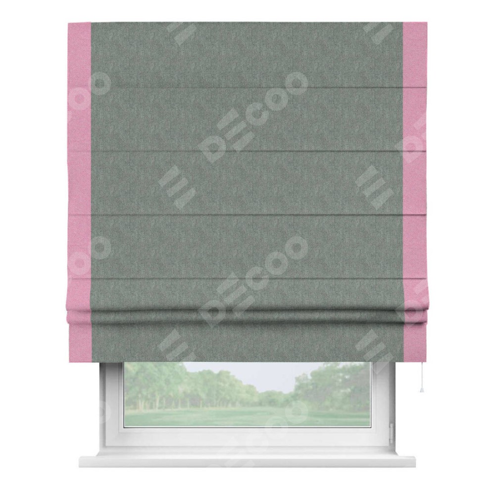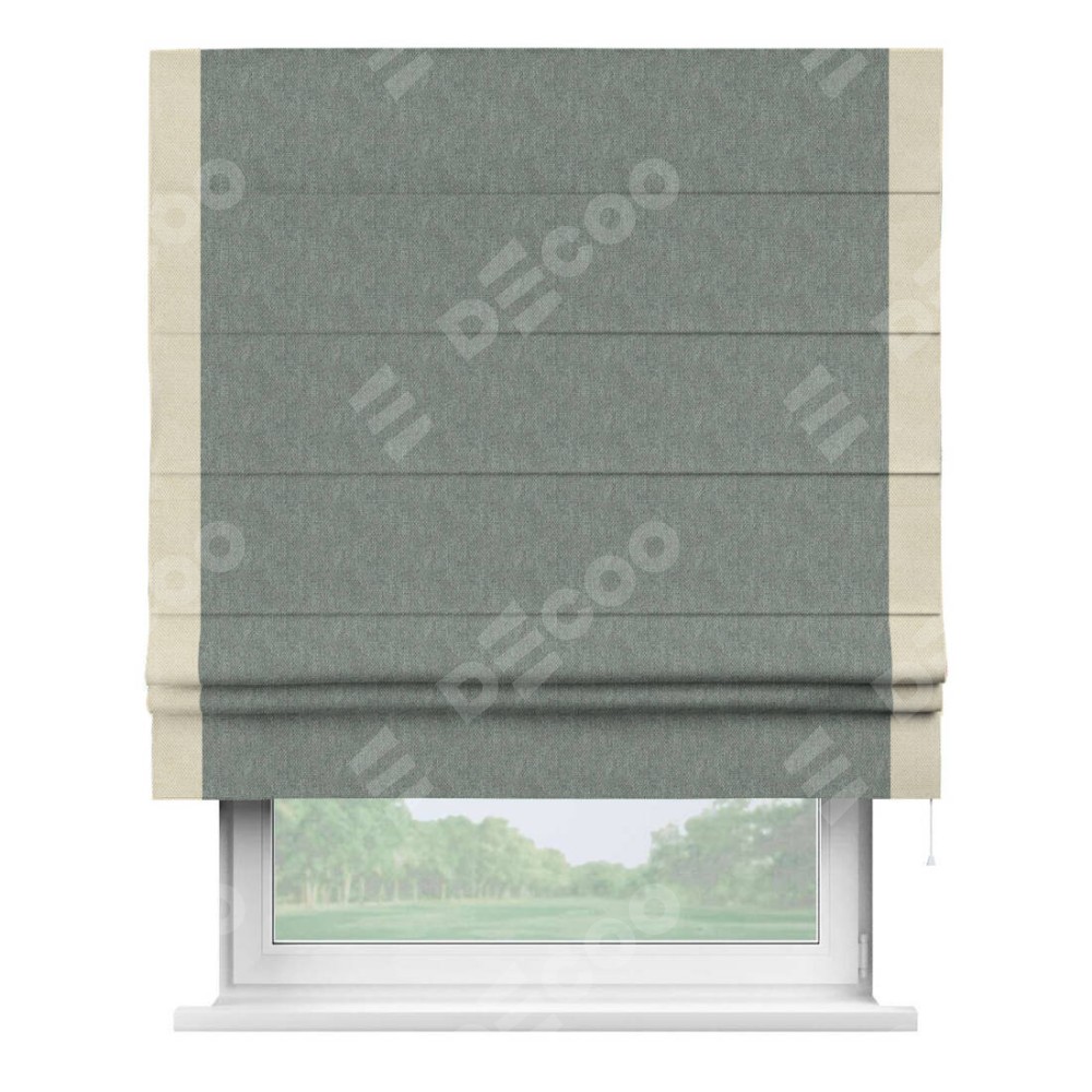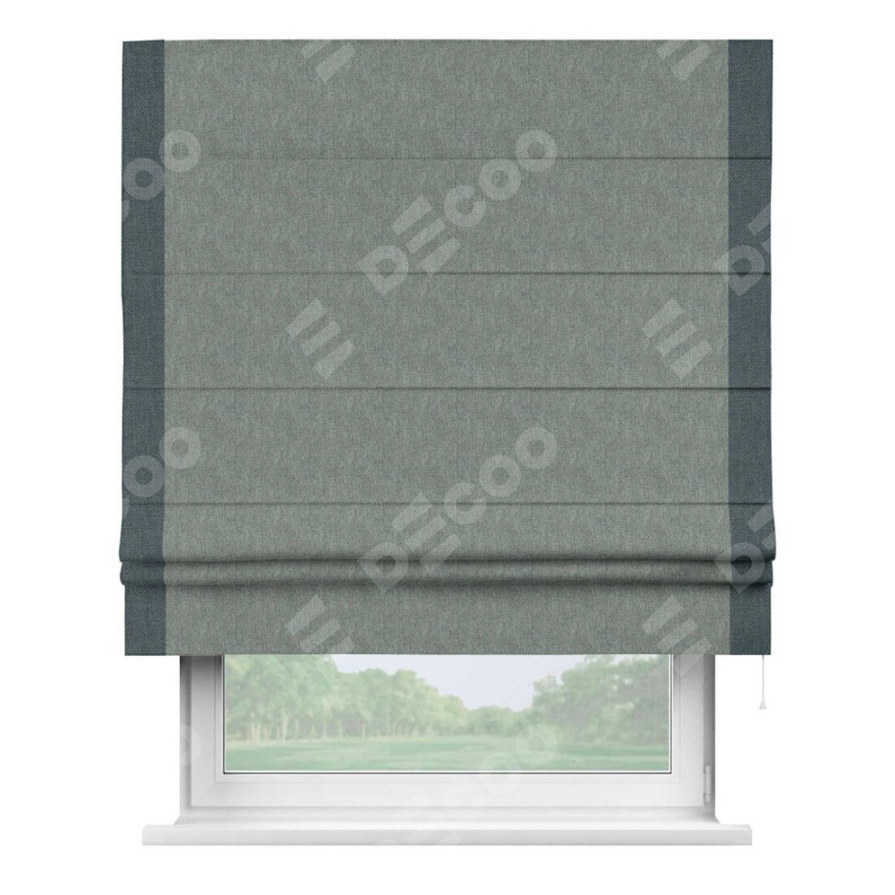 Римская штора производителя «Cortin», используется для проёма, пошита из ткани лён димаут серый, артикул 16240. Отделка шторы кантом «Стрим Дуо», ткань для канта используется из льна димаут разной расцветки на выбор. Имеет универсальный механизм и подходит для монтажа: на потолок, на стену и в нишу.