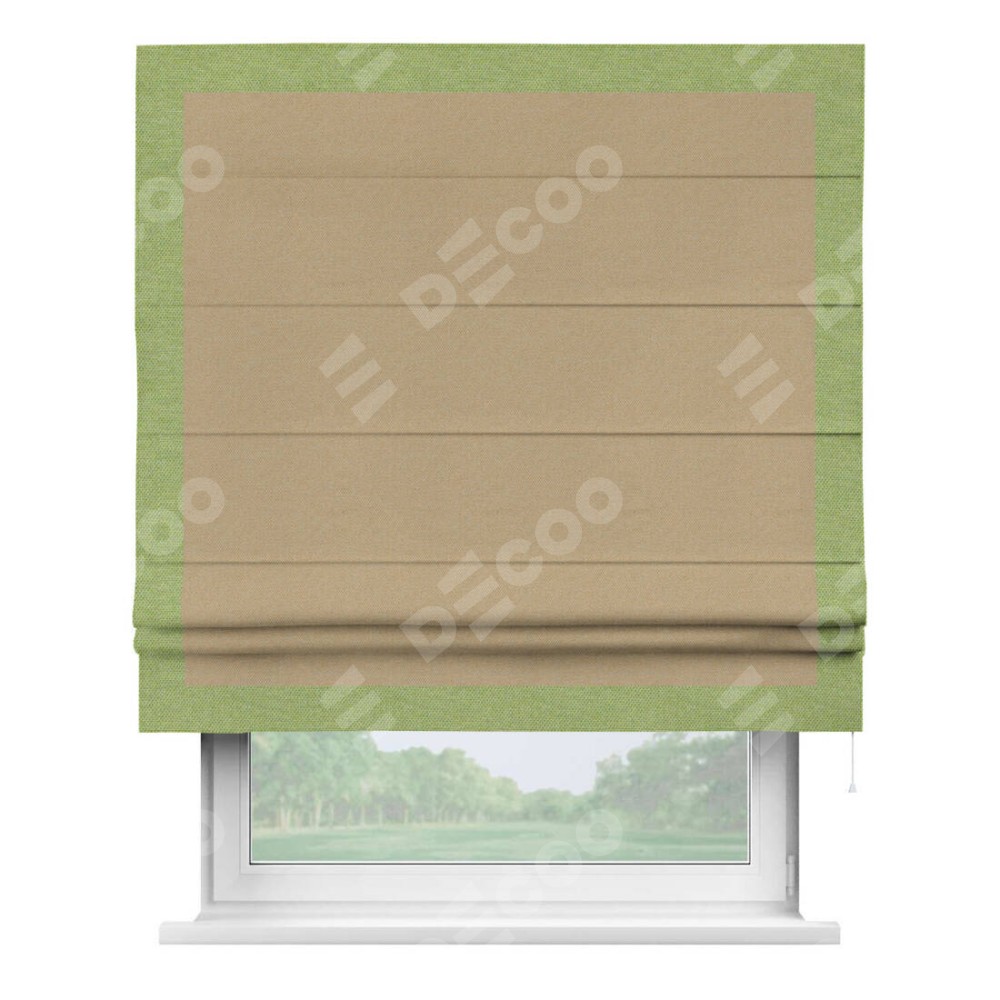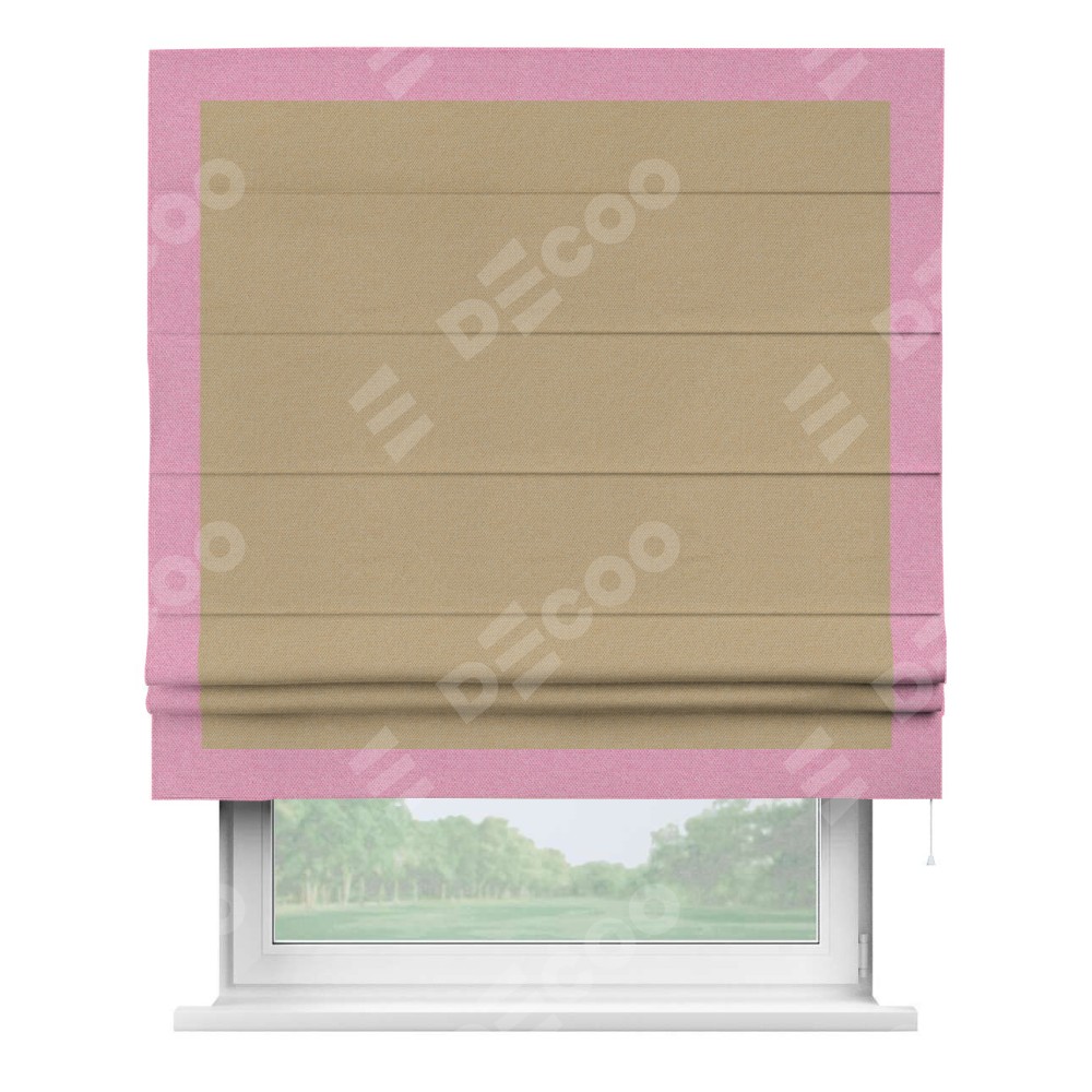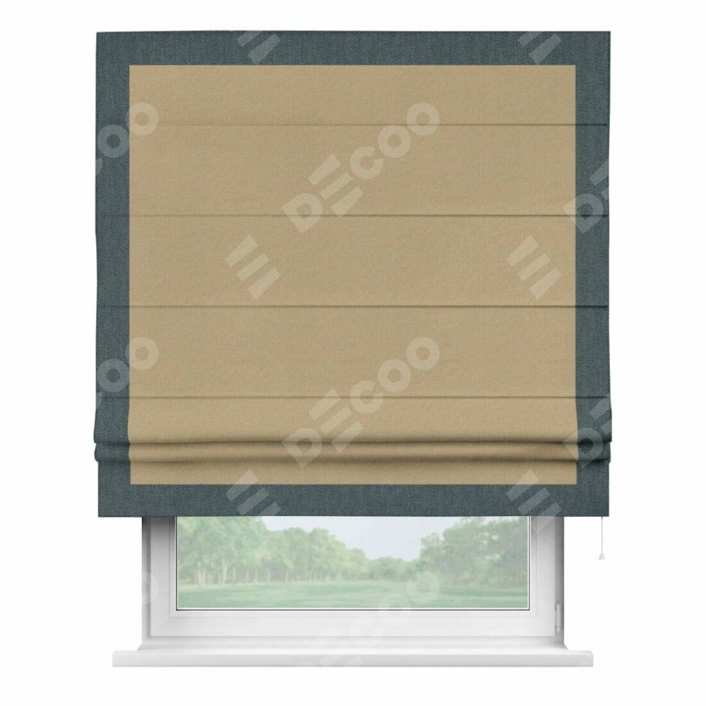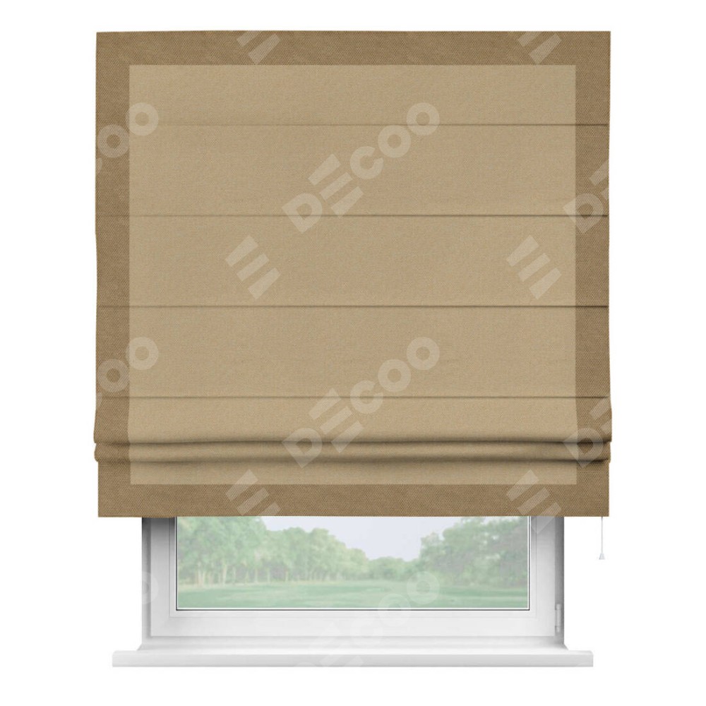 Римская штора производителя «Cortin», используется для проёма, пошита из ткани лён димаут тёмно-бежевый, артикул 83037. Отделка шторы кантом «Чесс», ткань для канта используется из льна димаут разной расцветки на выбор. Имеет универсальный механизм и подходит для монтажа: на потолок, на стену и в нишу.