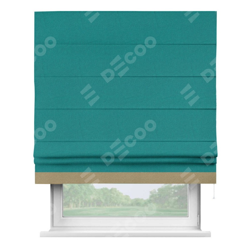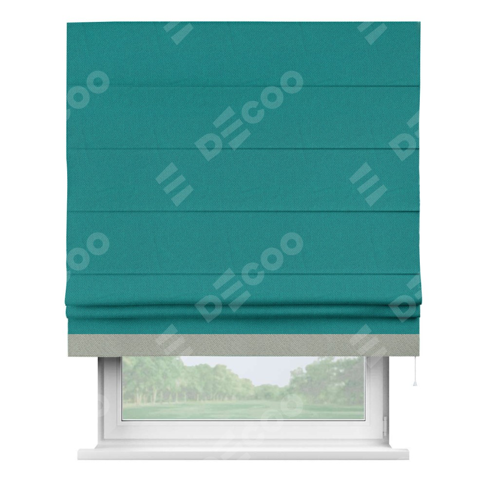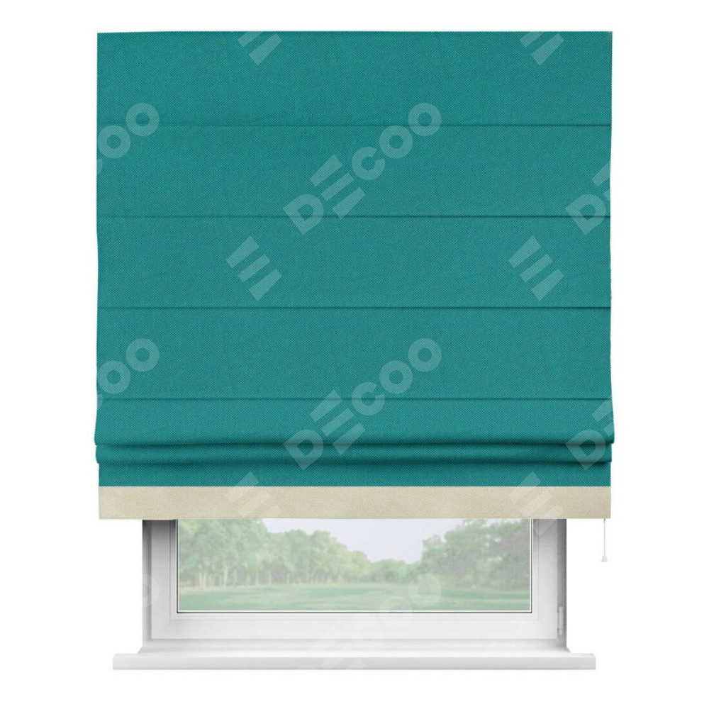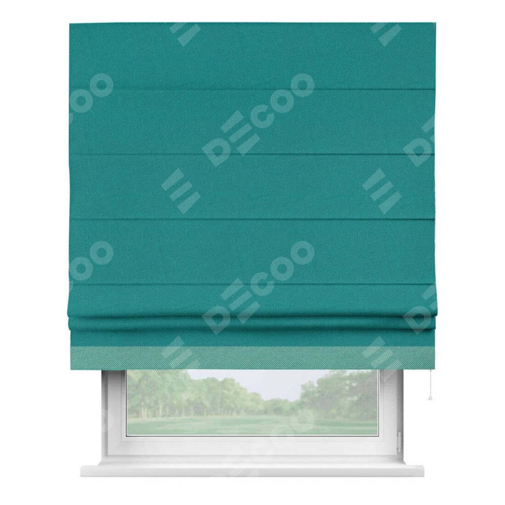 Римская штора производителя «Cortin», используется для проёма, пошита из ткани лён димаут тёмно-бирюзовый, артикул 318. Отделка шторы кантом «Джестер», ткань для канта используется из льна димаут разной расцветки на выбор. Имеет универсальный механизм и подходит для монтажа: на потолок, на стену и в нишу.