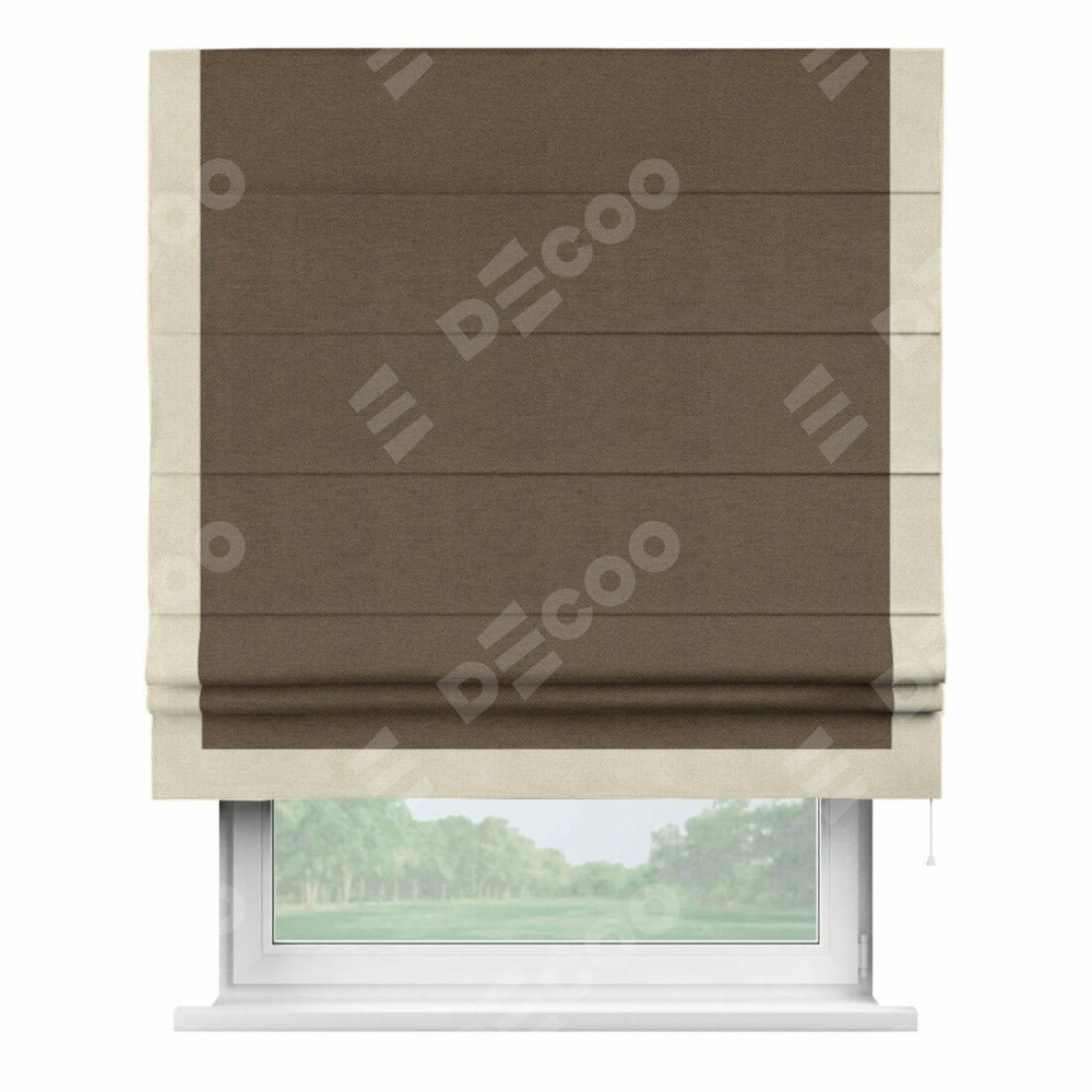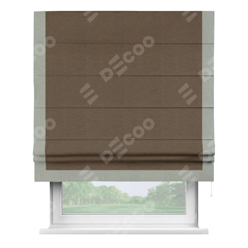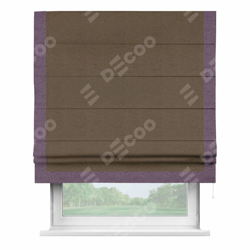 Римская штора производителя «Cortin», используется для проёма, пошита из ткани лён димаут тёмно-коричневый, артикул 83030. Отделка шторы кантом «Виктория», ткань для канта используется из льна димаут разной расцветки на выбор. Имеет универсальный механизм и подходит для монтажа: на потолок, на стену и в нишу.