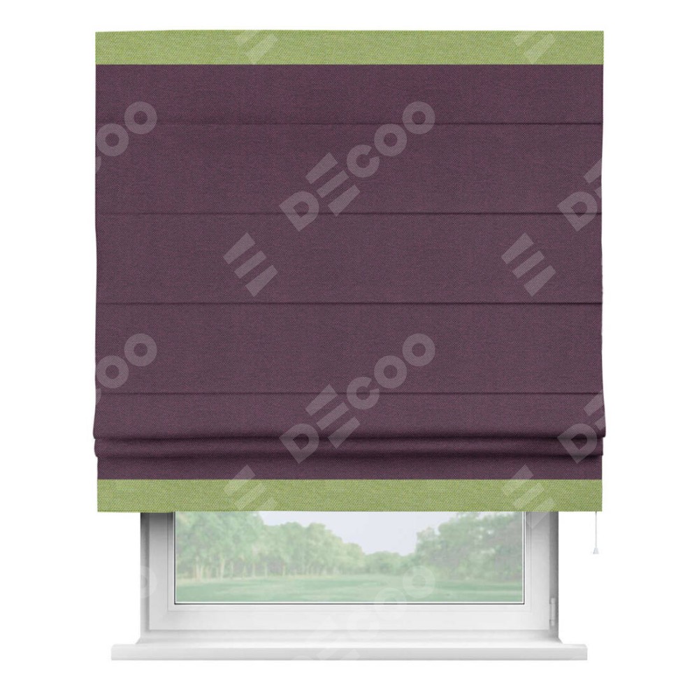 Римская штора производителя «Cortin», используется для проёма, пошита из ткани лён димаут фиолетовый, артикул 8817. Отделка шторы кантом «Горизонт», ткань для канта используется из льна димаут разной расцветки на выбор. Имеет универсальный механизм и подходит для монтажа: на потолок, на стену и в нишу.
