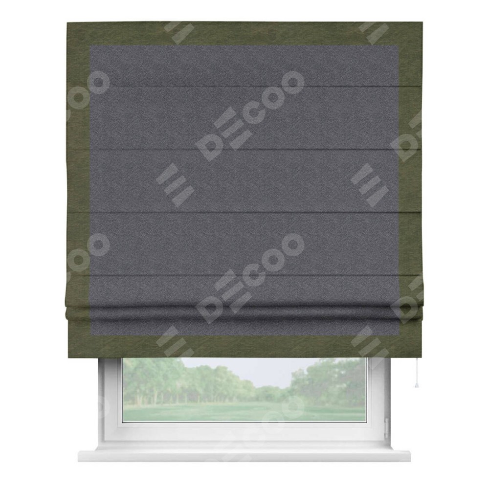 Римская штора производителя «Cortin», используется для проёма, пошита из ткани софт однотонный графит, артикул 19316. Отделка шторы кантом «Чесс», ткань для канта используется из софта разной расцветки на выбор. Имеет универсальный механизм и подходит для монтажа: на потолок, на стену и в нишу.